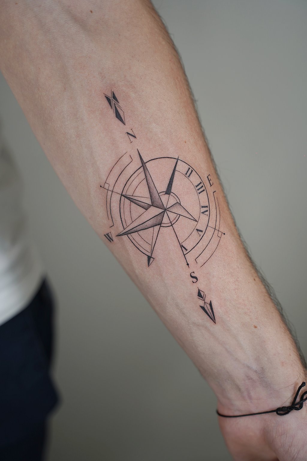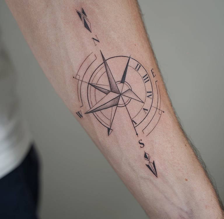 Un diseño más complejo que combina una brújula con un reloj, trabajado en línea fina con geometrías muy precisas. Es una pieza de mayor tamaño y con un nivel técnico elevado, ya que requiere exactitud en proporciones y simetría. Este tipo de tatuajes fineline grandes demuestran que el estilo delicado también puede ser potente y muy elaborado.
