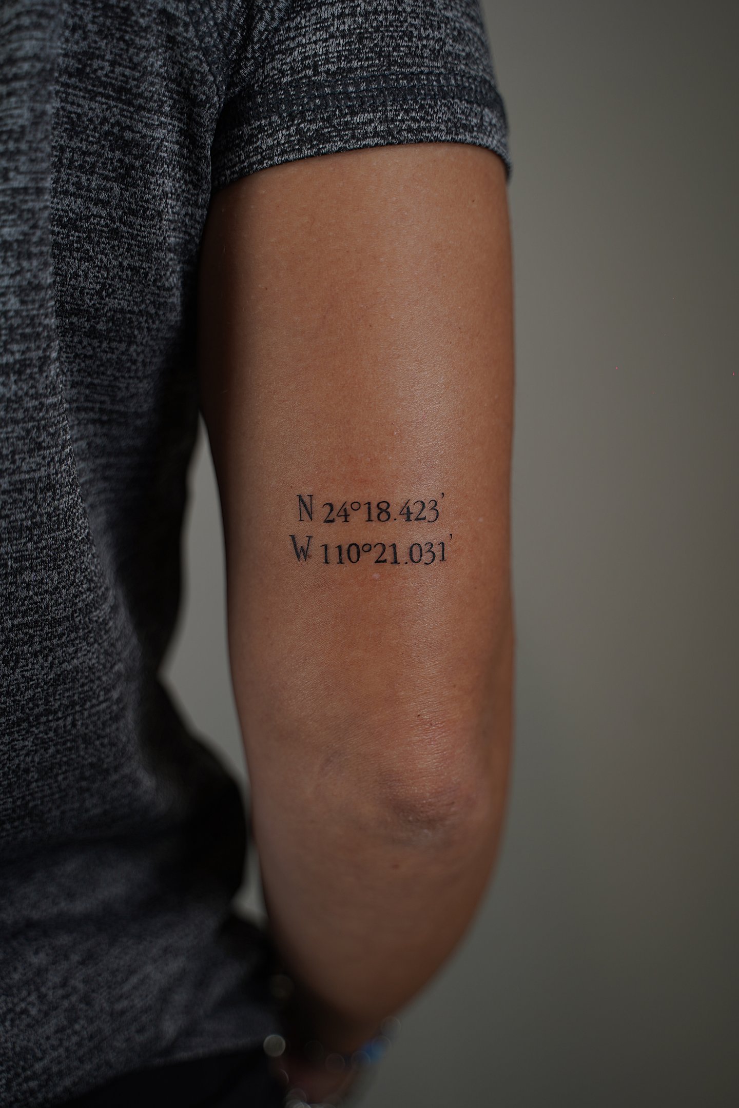 Un tatuaje de coordenadas situado encima del codo, ejecutado con una tipografía estilo máquina de escribir que combina trazos finos y ligeramente más gruesos. Este contraste le da presencia sin perder la delicadeza del fineline. Las coordenadas siempre esconden una historia personal, y este tipo de tipografía aporta un aire clásico y atemporal que funciona muy bien en zonas visibles.