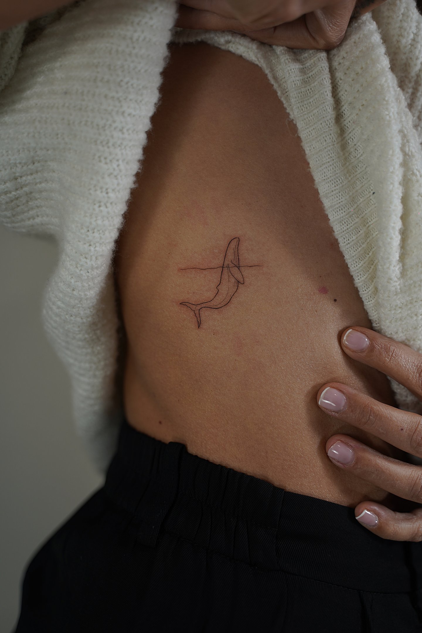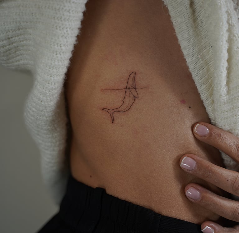 Una ballena en línea fina ubicada en las costillas, diseñada con un estilo simple pero muy equilibrado. El diseño mezcla líneas ligeramente más gruesas con otras más finas para generar profundidad sin recargar la pieza. Es un tatuaje delicado, elegante y con movimiento, ideal para quienes buscan algo simbólico pero visualmente ligero.