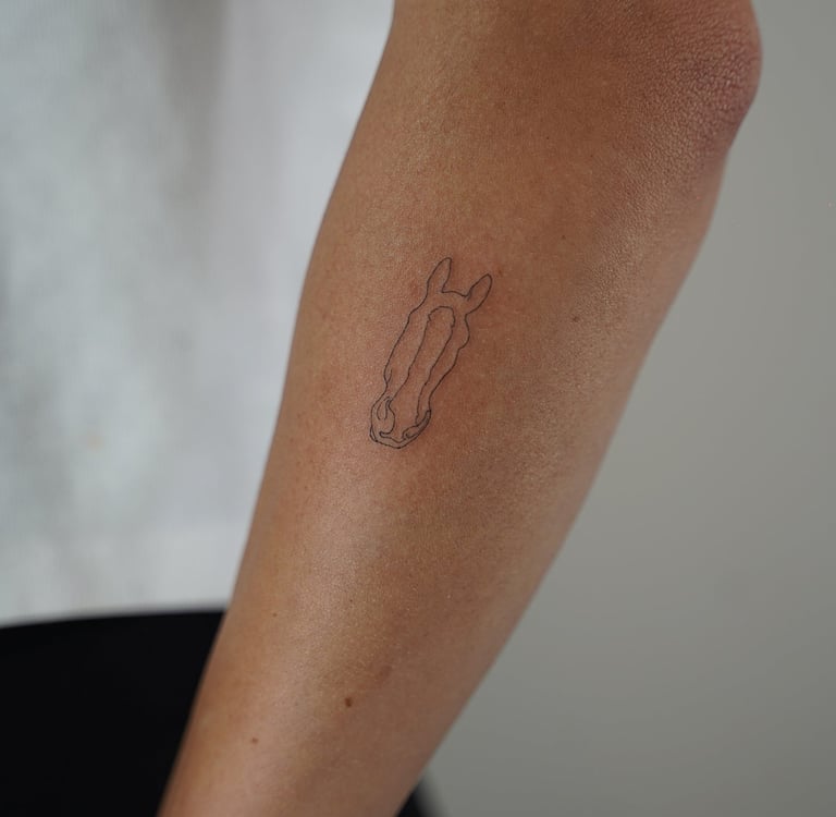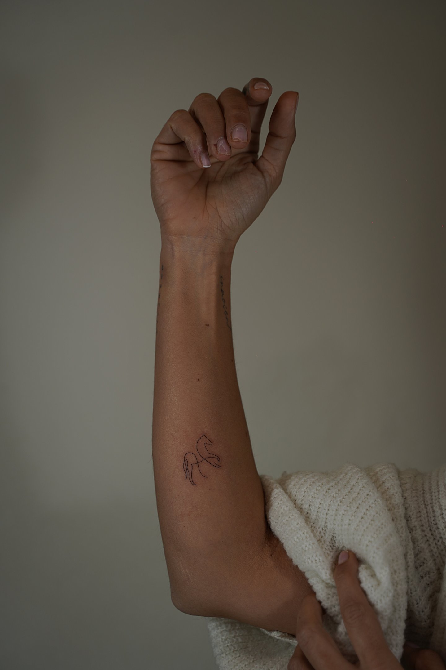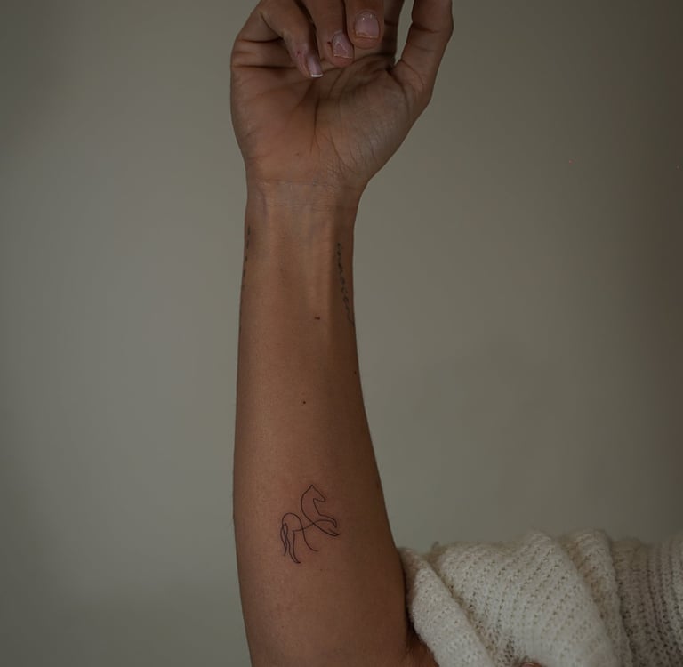 Un caballo realizado en estilo one line, es decir, dibujado con un solo trazo continuo. Este tipo de tatuaje destaca por su fluidez y naturalidad. En este caso, el diseño está orientado para que la persona pueda verlo directamente al mirar su antebrazo, convirtiéndolo en un tatuaje no solo estético, sino también personal y cercano.