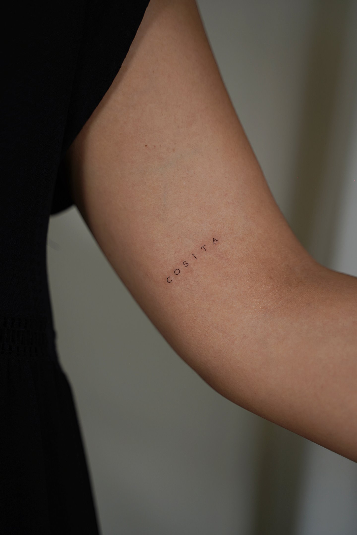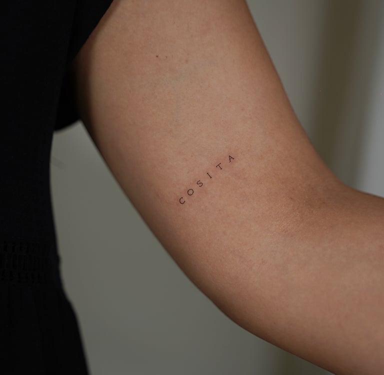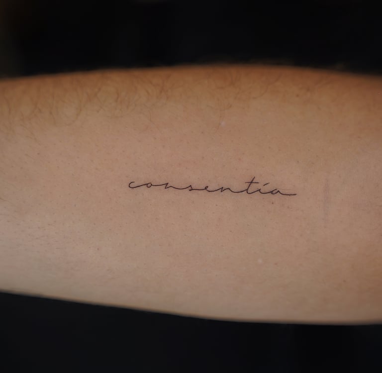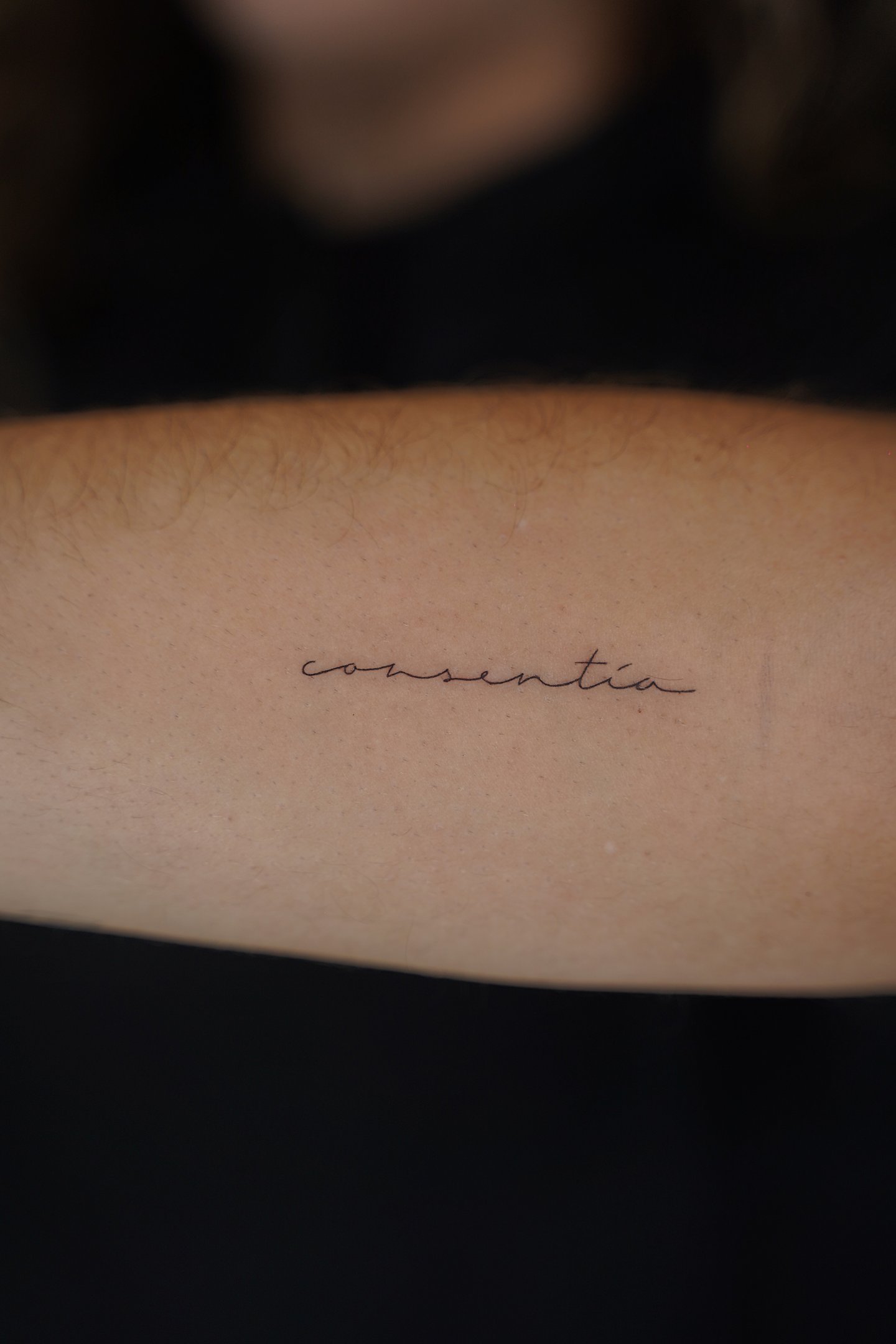 Un tatuaje fineline que transforma un apodo cariñoso en algo permanente y delicado. La palabra “Consentía”, inspirada en “consentida”, transmite ese matiz íntimo que solo entienden quienes comparten su significado. La tipografía cursiva elegida aporta fluidez y elegancia, haciendo que el resultado sea sutil pero con mucha personalidad. Nos encanta cómo una sola palabra puede transmitir tanto cuando se elige bien la letra.