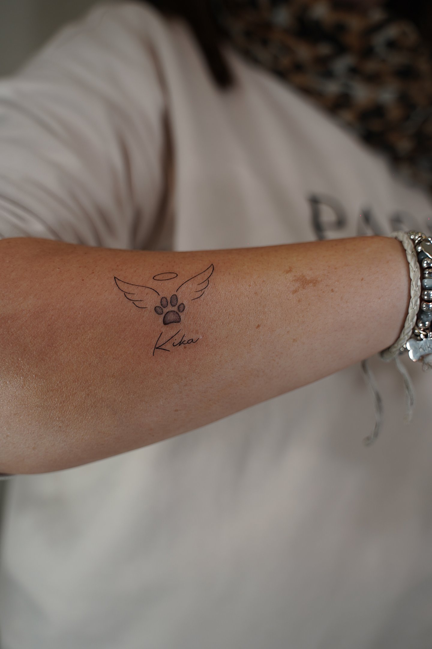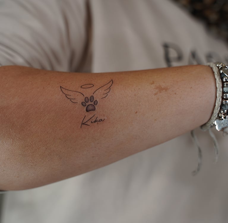 Un tatuaje cargado de emoción: la huella de una mascota acompañada de pequeñas alas y un halo de angelito, junto al nombre “Kika”. La composición combina varios elementos simbólicos sin perder la delicadeza del fineline. Ubicado en el antebrazo, este diseño funciona como un recuerdo permanente lleno de cariño hacia un perrito que dejó una huella imborrable.