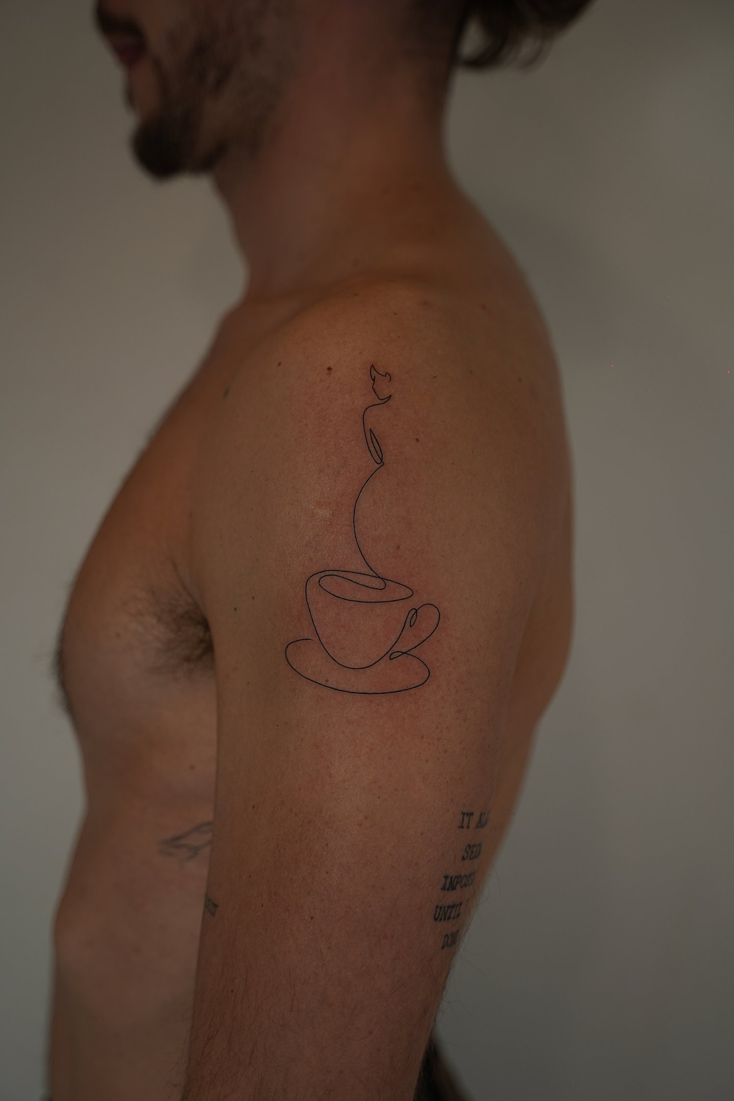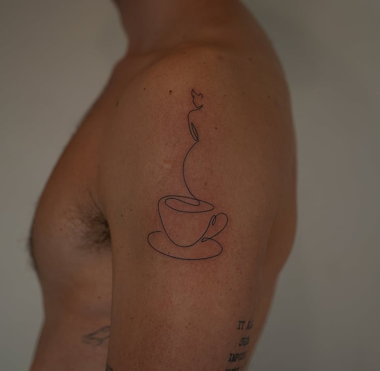 Un tatuaje en estilo one line donde, a través de un solo trazo continuo, se dibuja una taza que en la parte superior se transforma de forma abstracta en la silueta de una mujer. Es un diseño artístico y original, con un tamaño ligeramente mayor que los anteriores, que visualmente encaja muy bien en el hombro por la forma que acompaña la anatomía. Nos encanta cuando el fineline se mezcla con conceptos creativos y un punto más abstracto.