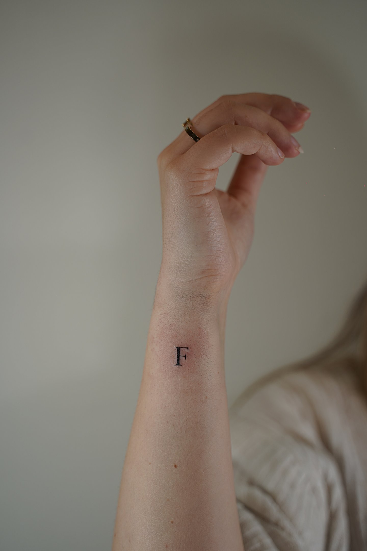 Otro tatuaje de inicial en tipografía estilo máquina de escribir, también en mayúscula, pero con una orientación lateral diferente. Para enseñarla correctamente, es necesario girar el brazo hacia un lado, lo que le da un toque más discreto y personal. La posición cambia completamente la forma en que se percibe el diseño y demuestra cómo en el estilo fineline no solo importa la letra, sino también cómo se integra en el cuerpo.