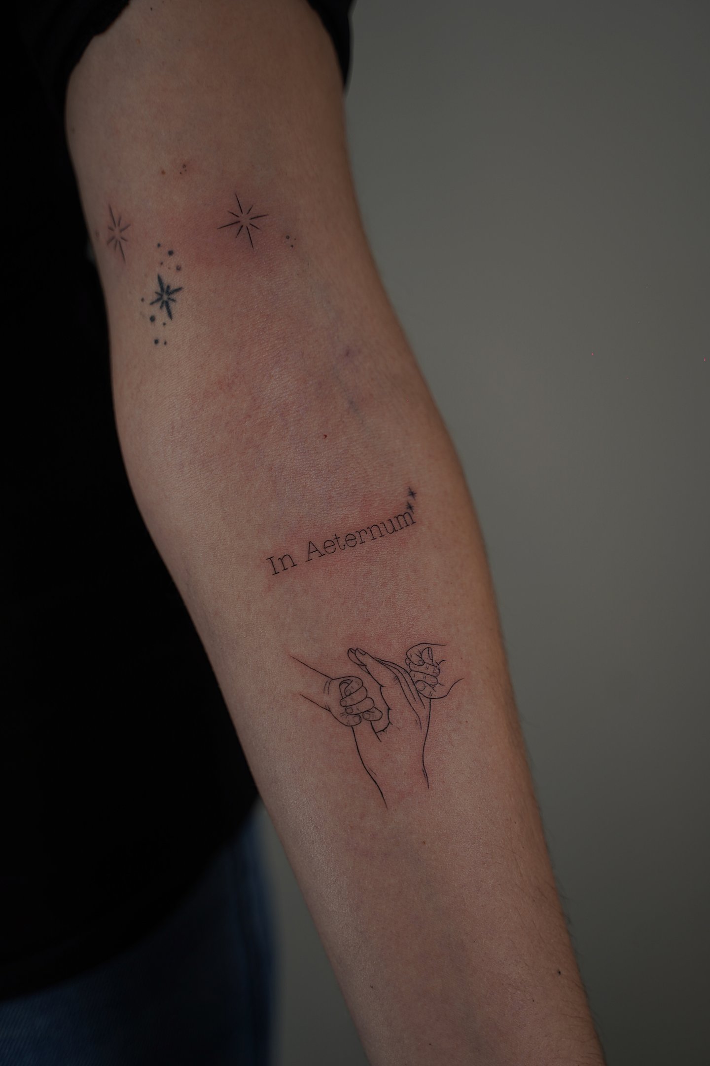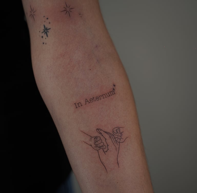“In Aeternum” es una expresión en latín que significa “para siempre” o “eternamente”. En este diseño, la frase se acompaña de una mano adulta de la que salen dos manos infantiles sujetando sus dedos. La composición transmite protección, vínculo y continuidad entre generaciones sin necesidad de explicar una historia concreta. Es un tatuaje profundamente emotivo que habla de amor eterno, familia y conexión más allá del tiempo.