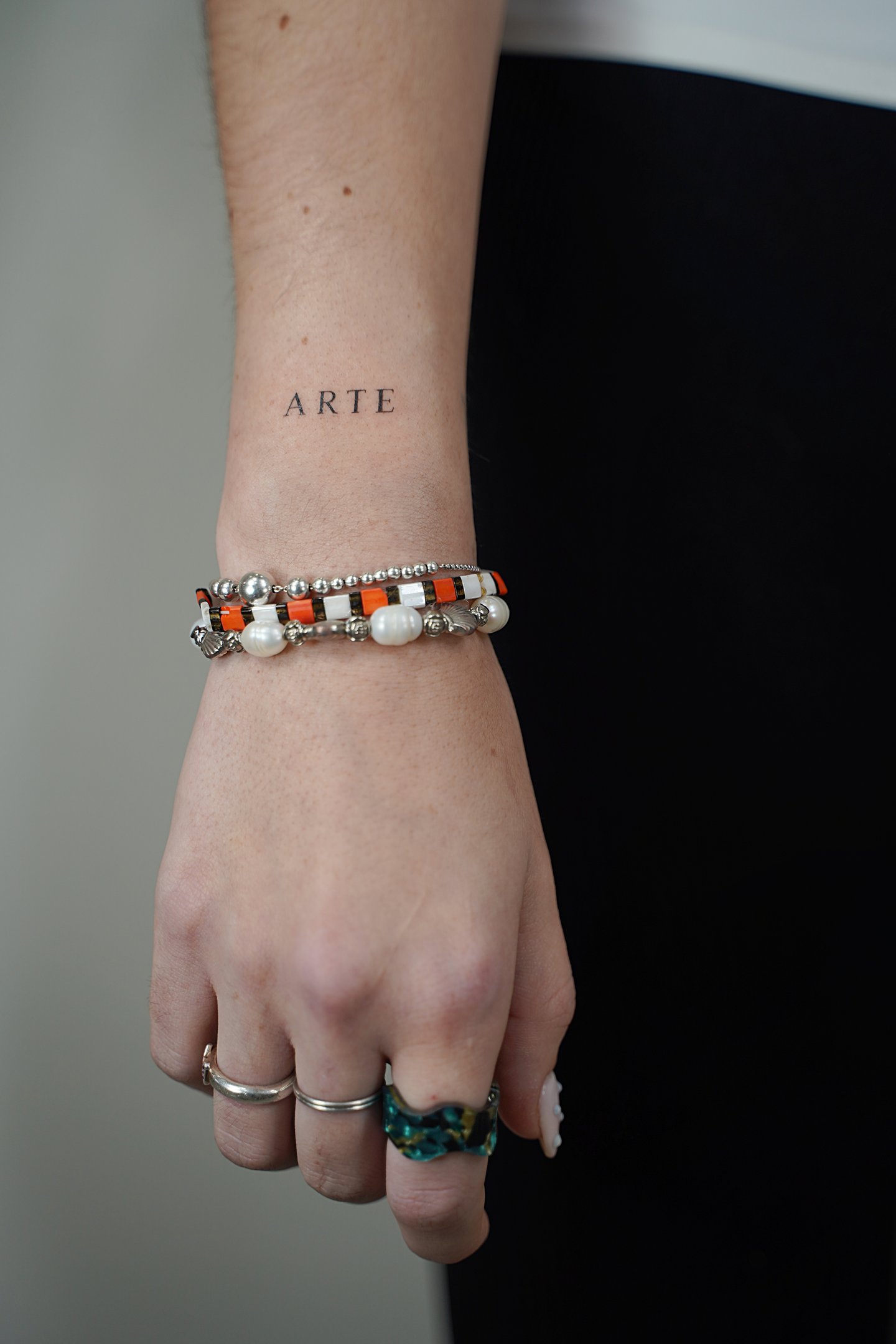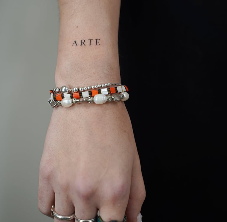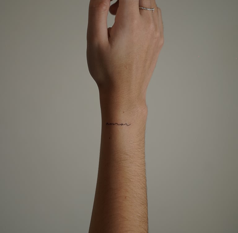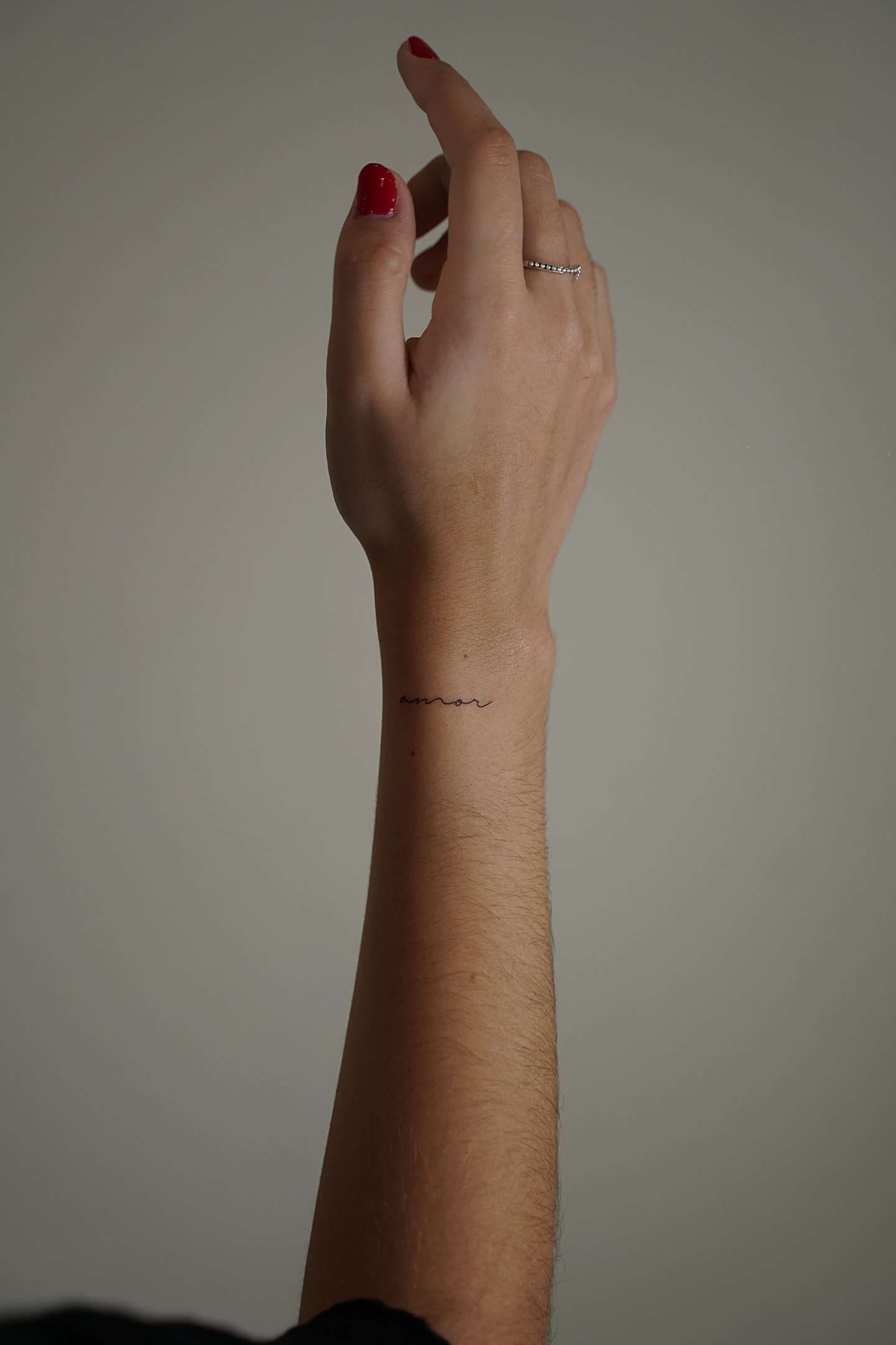 La palabra “Amor” tatuada en la muñeca, en una zona estratégica que puede cubrirse fácilmente con una pulsera o un reloj. Además, la ubicación elegida no es la más habitual, lo que le da un toque diferente y original. El resultado es delicado, íntimo y fácil de llevar en el día a día.