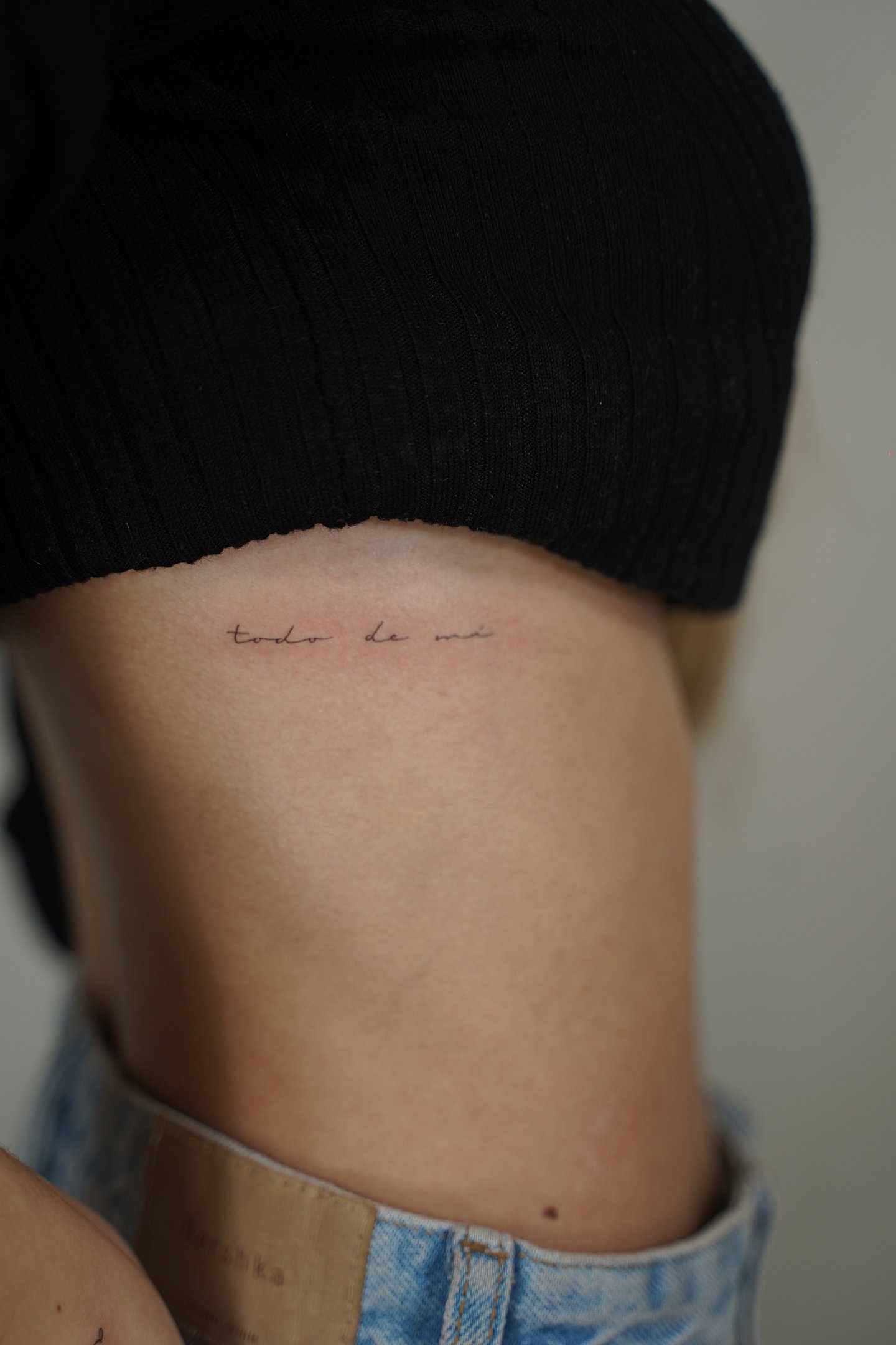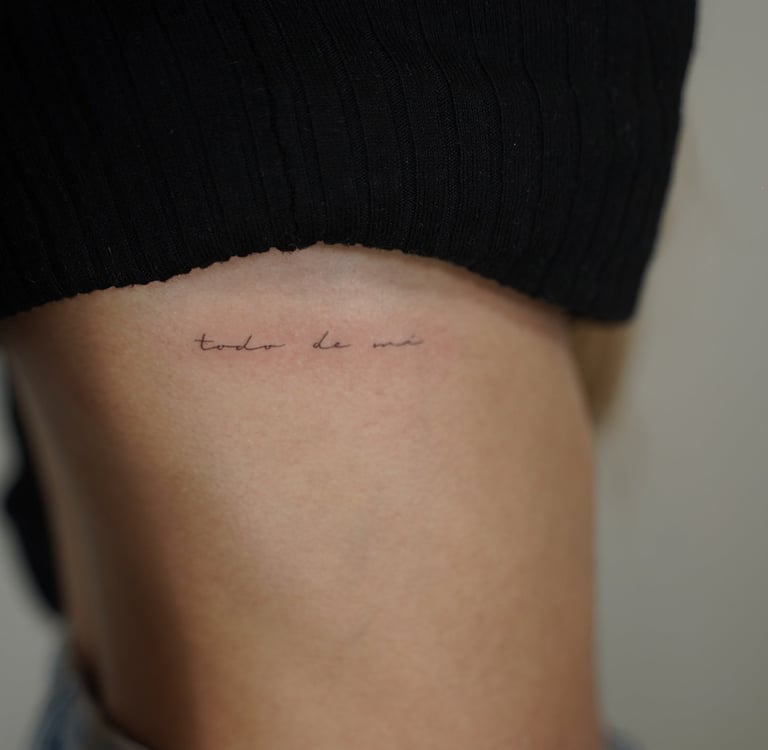 Las frases horizontales en las costillas funcionan especialmente bien por cómo siguen la línea natural del cuerpo. En este caso, “Todo de mí” se adapta perfectamente a la zona, creando un efecto limpio, elegante y muy estilizado. Es una ubicación que potencia la delicadeza del fineline y aporta un aire más personal y reservado.