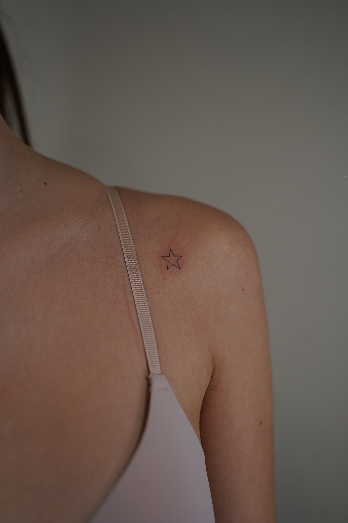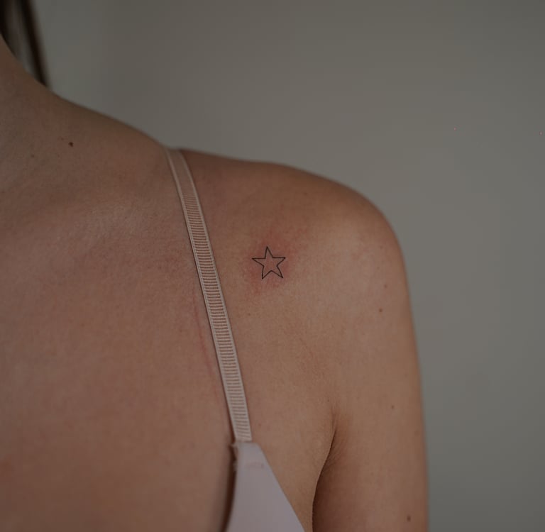 Las estrellas en el hombro son un clásico dentro del mundo del tatuaje. Hace años se realizaban con trazos mucho más gruesos y marcados, pero en esta versión fineline se reinterpretan con un estilo mucho más delicado y actual. El resultado mantiene la esencia atemporal del símbolo, pero con una estética más ligera y elegante.