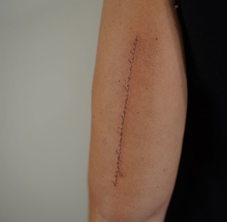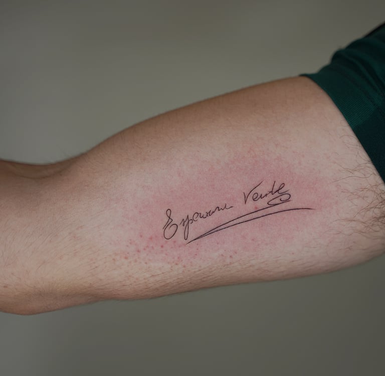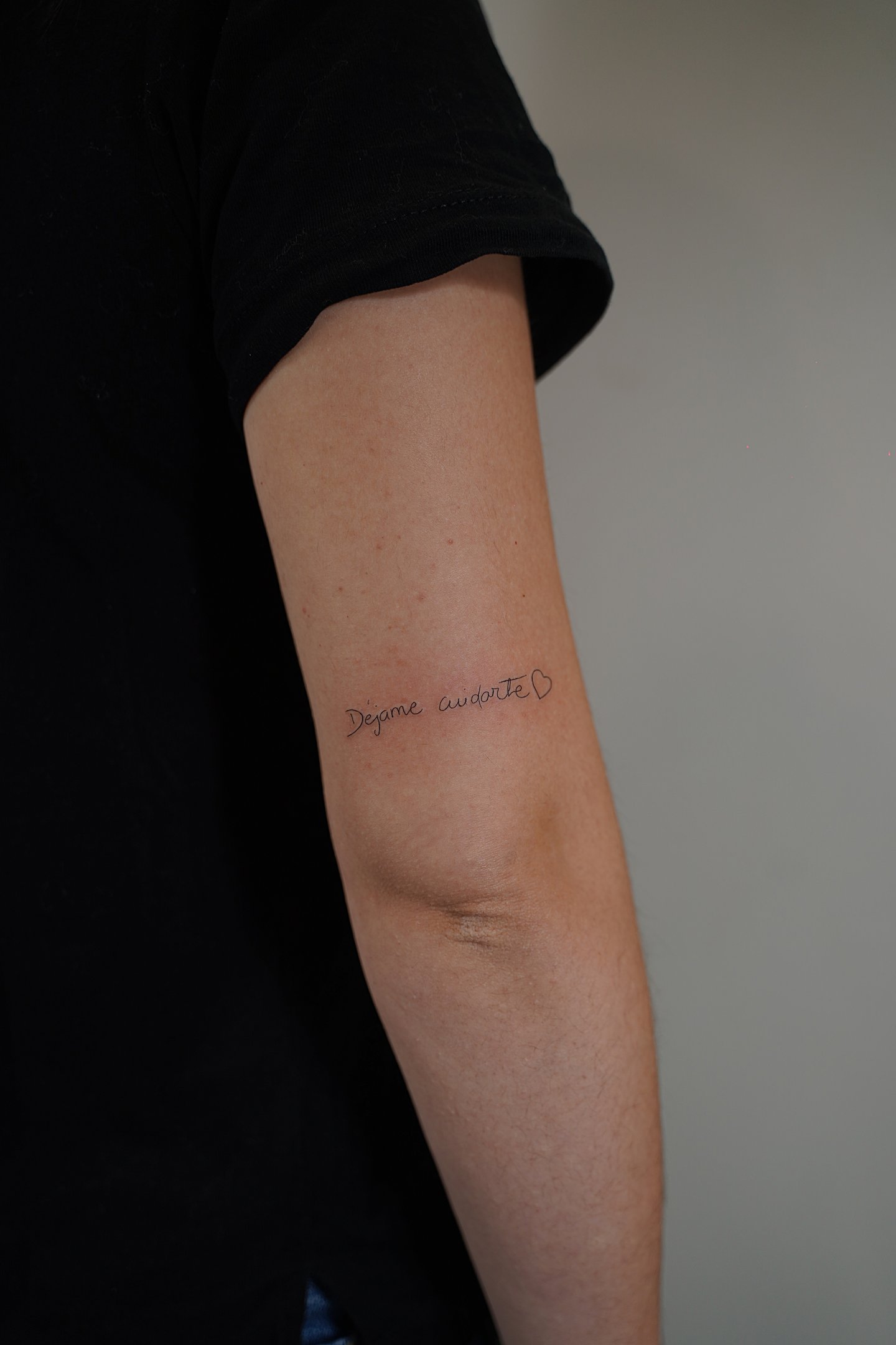 Una frase cargada de ternura: “Déjame cuidarte”, acompañada de un pequeño corazón. El detalle más especial es que está escrito por un ser querido, lo que añade un valor emocional aún mayor. El fineline permite respetar la naturalidad de la escritura original, manteniendo cada trazo tal como fue escrito. Un tatuaje íntimo, delicado y lleno de significado.