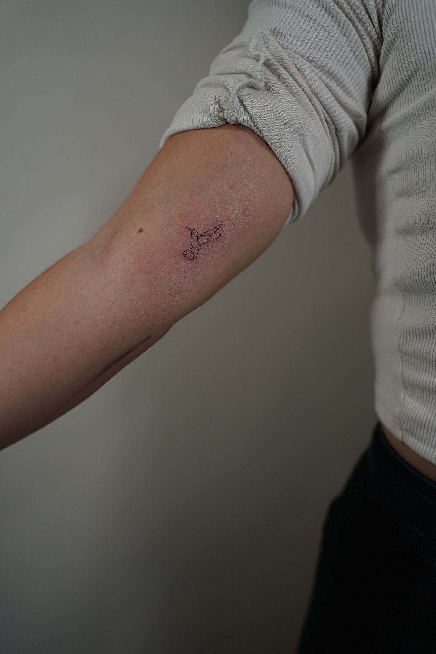 Un colibrí realizado con un solo trazo continuo, en estilo one line. Este tipo de ejecución aporta fluidez, movimiento y una sensación muy orgánica. Está situado en una zona ligeramente escondida del brazo, lo que lo convierte en un detalle íntimo y discreto. El resultado es minimalista, elegante y con mucho simbolismo.