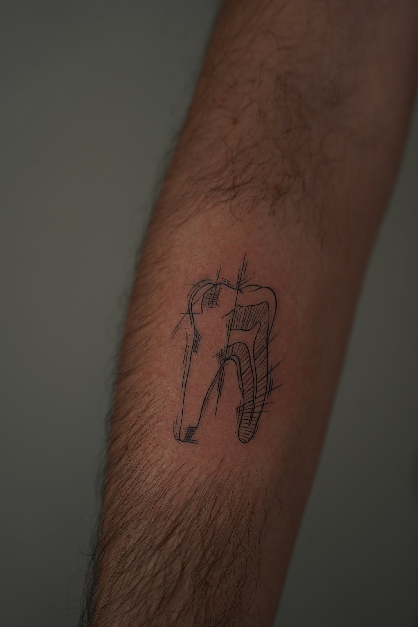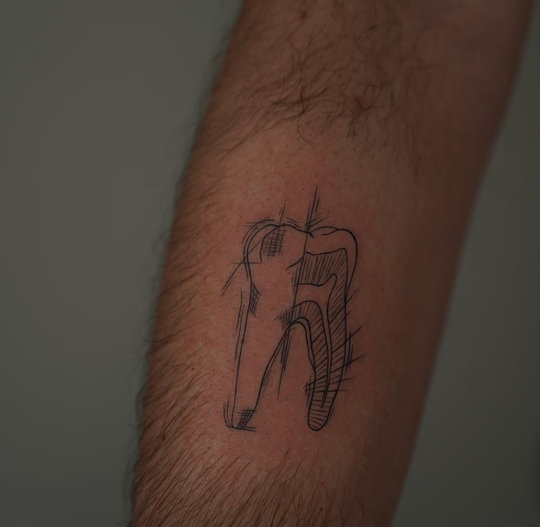 Un tatuaje de un diente trabajado con un estilo tipo sketch, utilizando múltiples líneas que generan sensación de movimiento y profundidad. Se aprecian tanto las formas externas como algunos detalles internos, lo que le da un carácter técnico y artístico al mismo tiempo. Este tipo de diseños suelen ser muy solicitados por dentistas o profesionales del sector que buscan algo relacionado con su profesión pero con un enfoque creativo.
