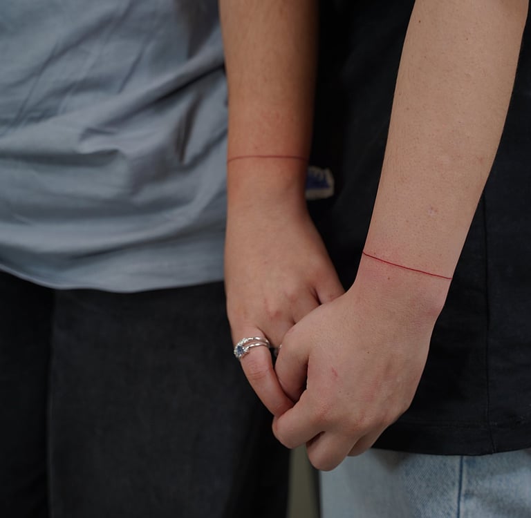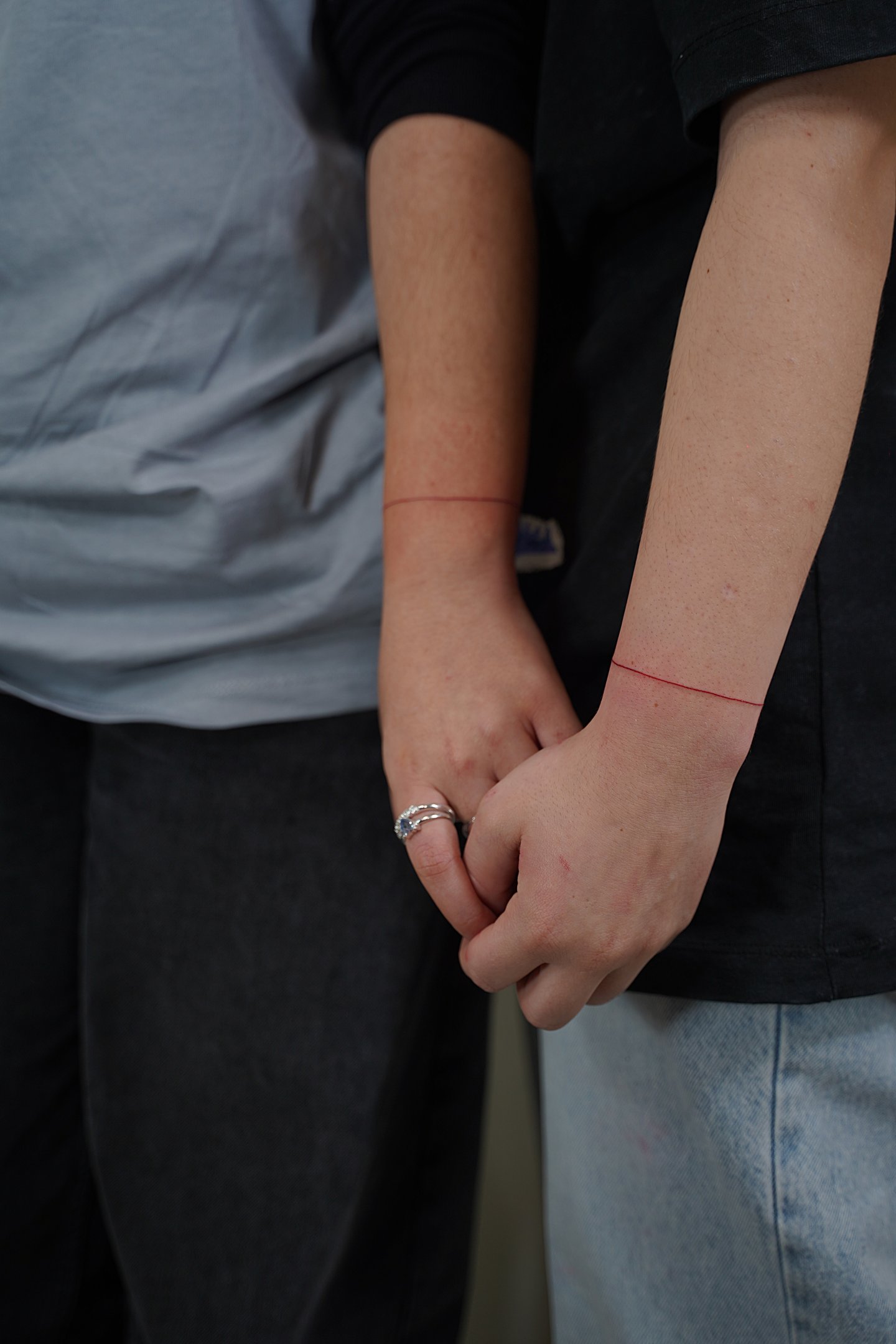 Una línea roja fina que rodea la muñeca, realizada como tatuaje matching. Este diseño suele asociarse a la conocida leyenda del “hilo rojo”, que simboliza la unión invisible entre personas destinadas a encontrarse o permanecer conectadas. Más allá de la historia concreta, representa vínculo, conexión y unión permanente. Es un tatuaje sencillo en apariencia, pero con un significado profundo.