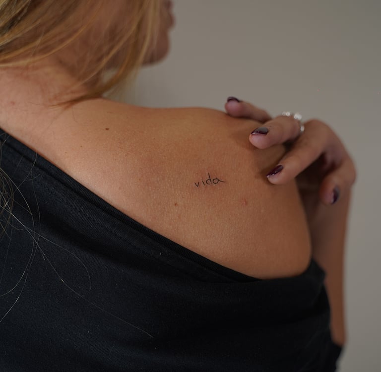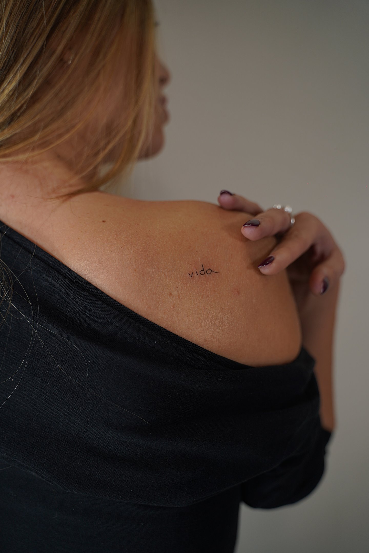 La palabra “vida” tatuada de forma discreta en el hombro, completamente en minúsculas. Ese detalle tipográfico aporta suavidad y cercanía al diseño. Es un tatuaje pequeño, limpio y minimalista, que demuestra cómo una sola palabra puede transmitir un mensaje potente sin necesidad de grandes dimensiones.
