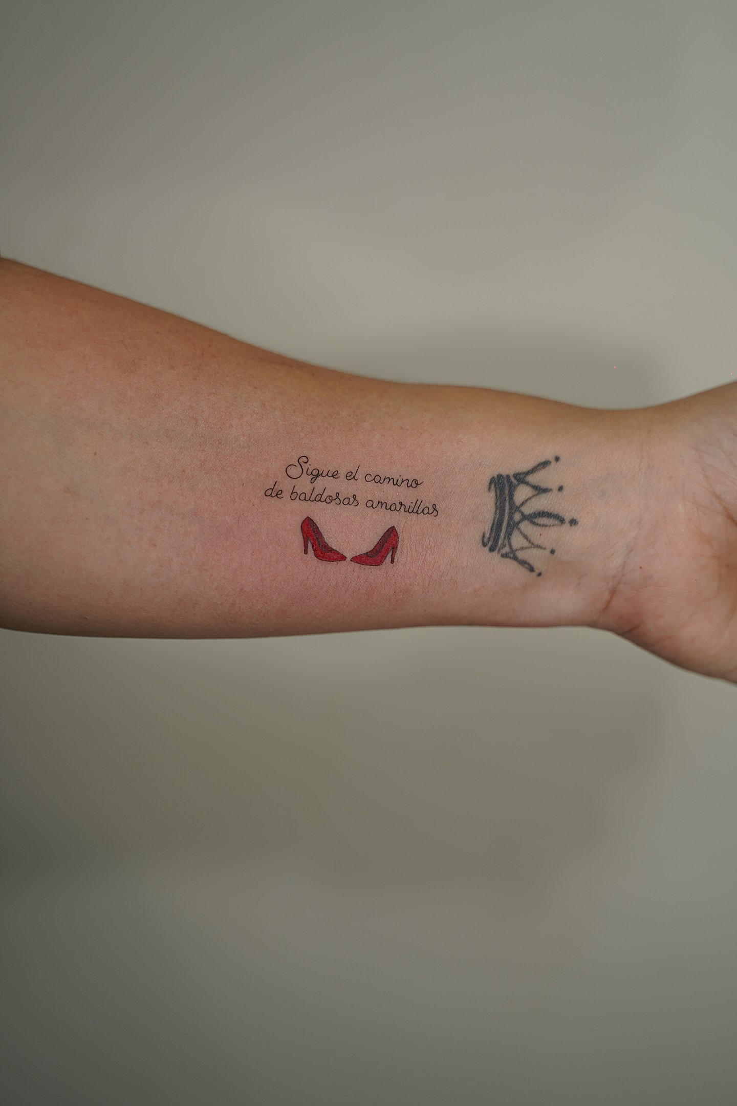 La frase “Sigue el camino de baldosas amarillas” hace referencia al universo de El Mago de Oz, donde el camino amarillo simboliza el viaje, la búsqueda y el crecimiento personal. Los tacones rojos refuerzan ese guiño a la historia clásica, evocando determinación y deseo de volver a casa, pero también la idea de seguir tu propio destino. Realizado en letra cursiva, el diseño mezcla fantasía, mensaje personal y un toque femenino muy marcado.