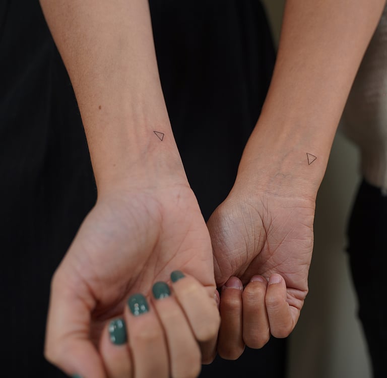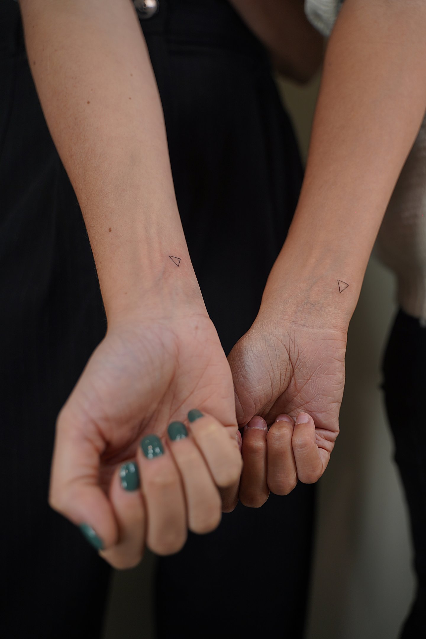 Dos triángulos minimalistas, colocados en la misma zona junto a la muñeca, en tamaño muy pequeño. Este tipo de matching tattoos suelen simbolizar equilibrio, conexión o etapas compartidas. La simplicidad geométrica hace que el diseño sea discreto, elegante y fácil de llevar en el día a día.