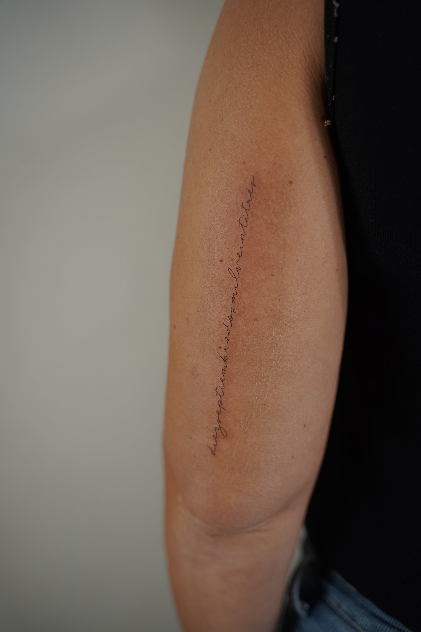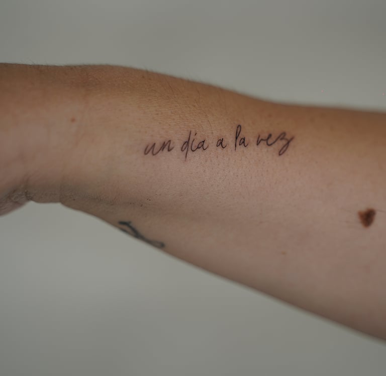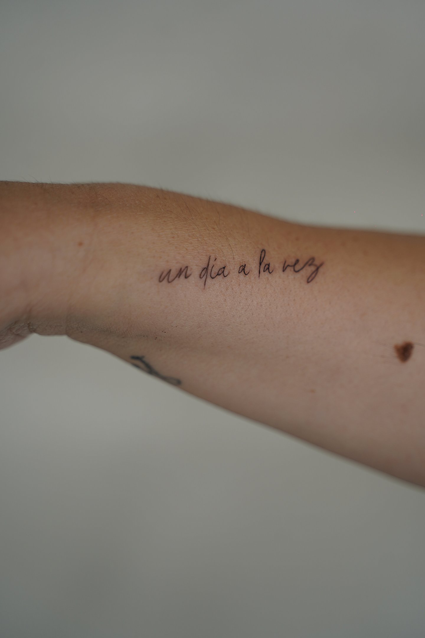 La frase “Un día a la vez” transmite una filosofía clara: avanzar paso a paso, sin mirar demasiado lejos. Es un mensaje asociado a la resiliencia, la paciencia y la importancia de vivir el presente. En este caso, está situada en una zona del brazo pensada para que la propia persona pueda leerla fácilmente, convirtiéndola en un recordatorio constante y muy personal.