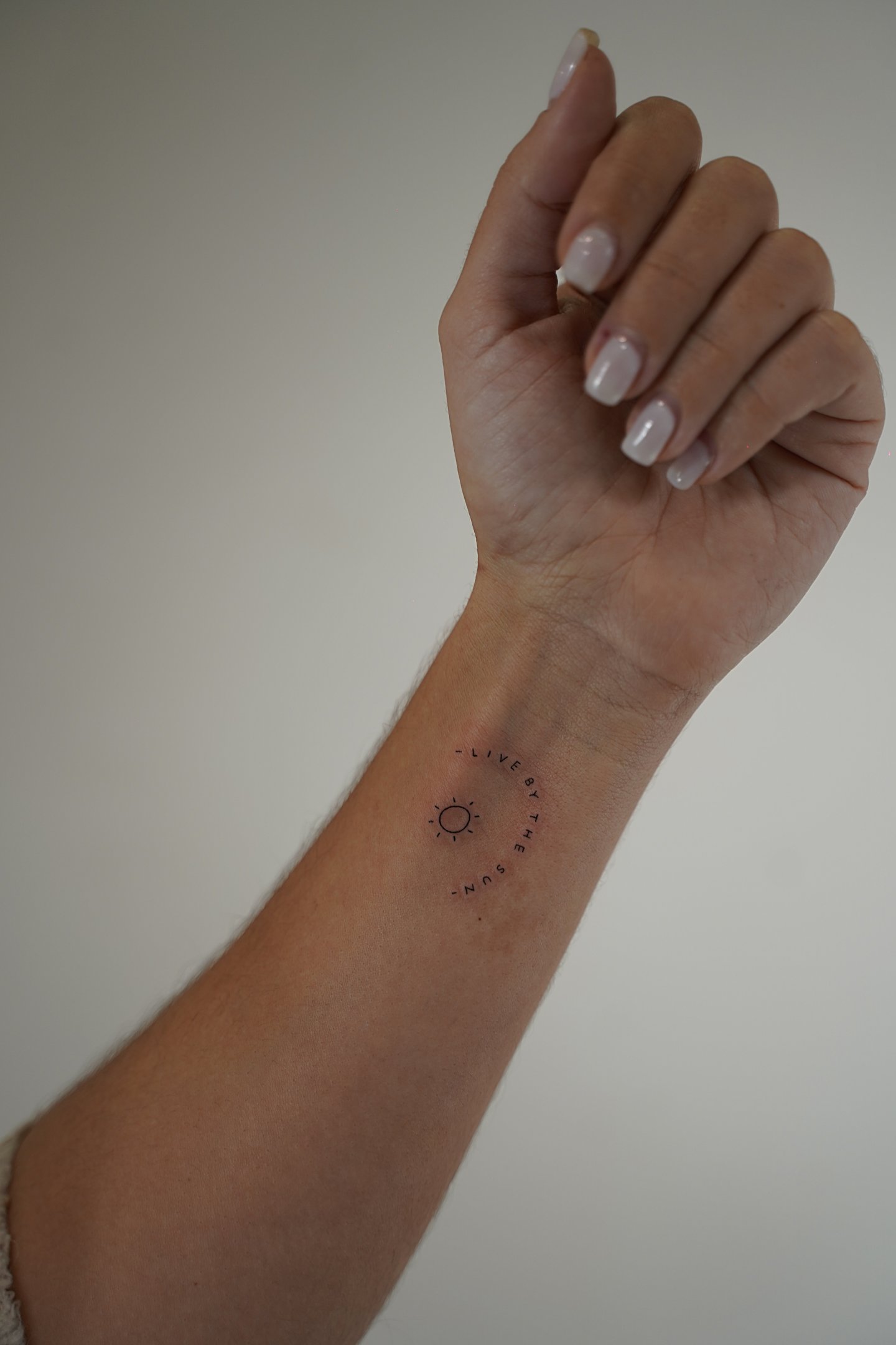 La frase “Live by the sun” acompañada de un pequeño sol refuerza un mensaje de energía, vitalidad y optimismo. Situado en una zona del brazo donde el cliente puede leérselo fácilmente, funciona como un recordatorio constante de vivir con luz y actitud positiva. El detalle del sol en línea fina aporta equilibrio visual sin recargar el diseño.