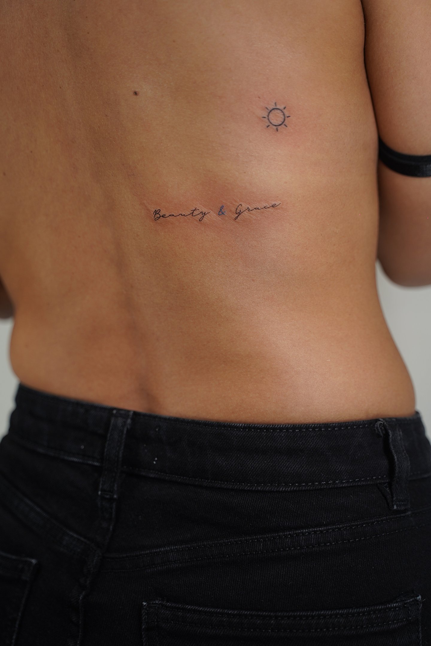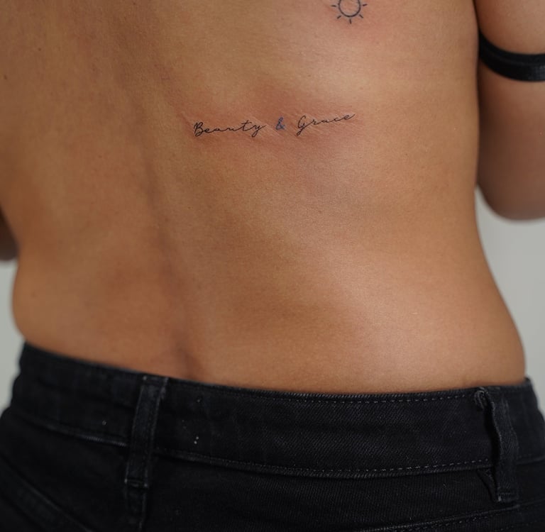 Un conjunto de dos tatuajes que comparten coherencia estética. Por un lado, la frase “Beauty and Grace” situada en la espalda, con la particularidad de que la palabra “and” está realizada en azul, creando un contraste sutil y elegante. Por otro lado, un sol minimalista también en azul, sencillo pero diferente. Ambos diseños mantienen la delicadeza del fineline y demuestran cómo un pequeño detalle en color puede aportar personalidad sin perder elegancia.