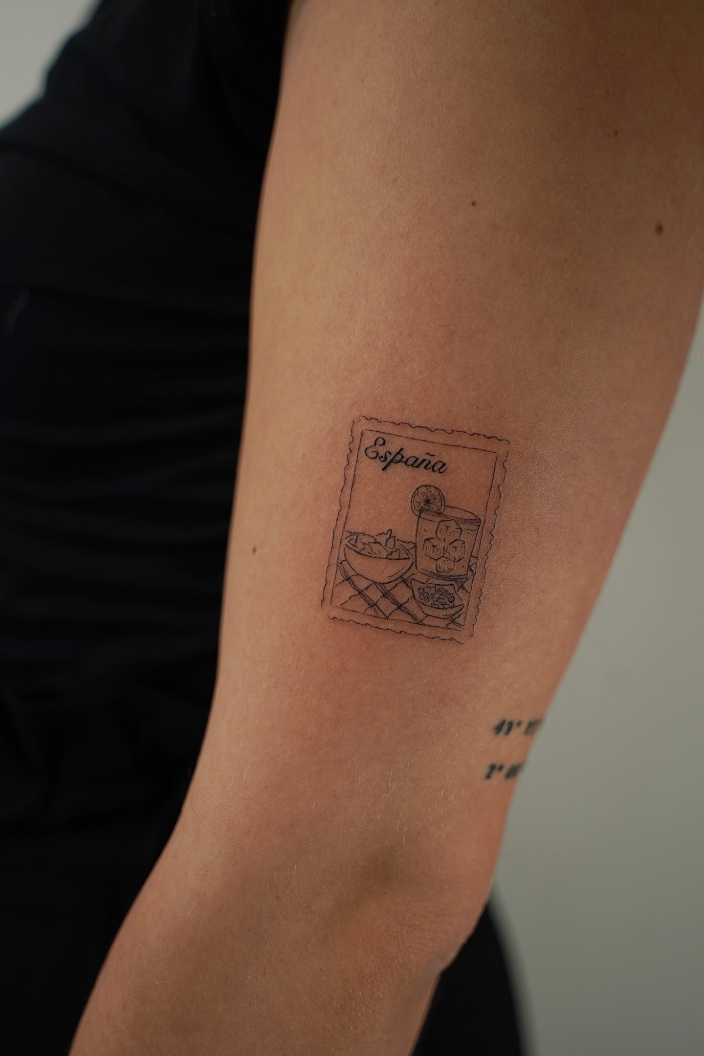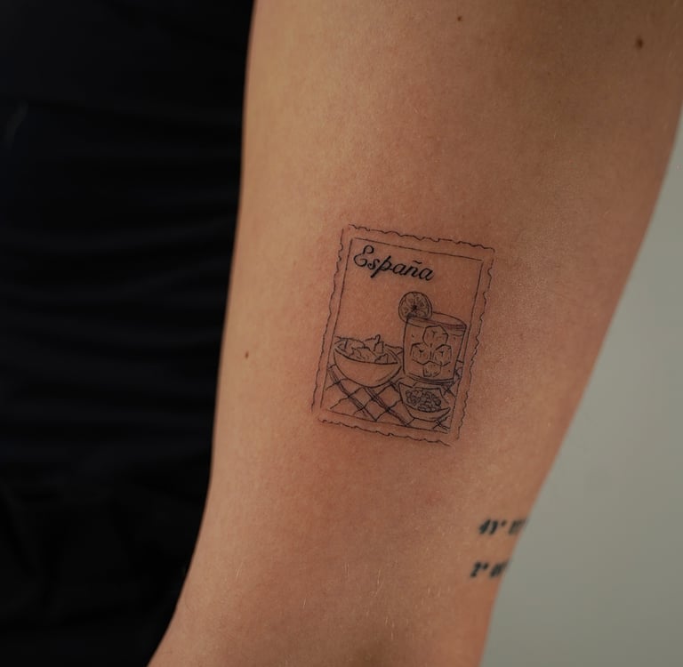 Un diseño que representa la silueta de España como recuerdo de viaje. En su interior incorpora pequeños símbolos que hacen referencia a la experiencia vivida. Funciona como una postal permanente en la piel, perfecta para quienes quieren llevarse un recuerdo significativo de un lugar especial.