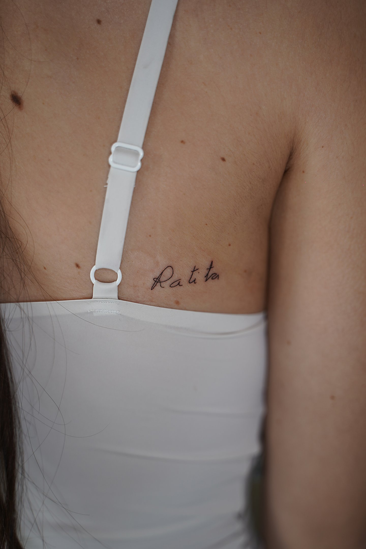 La palabra “ratita”, escrita por otra persona, representa un apodo íntimo y lleno de cariño. Ubicado en una zona discreta de la espalda, el diseño mantiene la delicadeza del trazo original. Es uno de esos tatuajes que solo se enseñan cuando uno quiere.