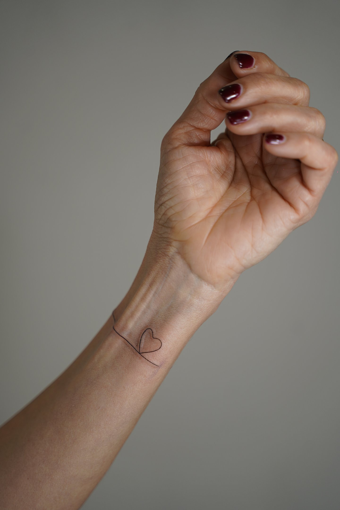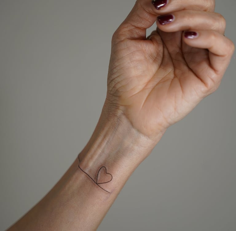 Un pequeño corazón apoyado sobre una línea fina, situado en la muñeca. La orientación está pensada para que la persona pueda verlo fácilmente. Es un diseño minimalista, íntimo y con un simbolismo claro.