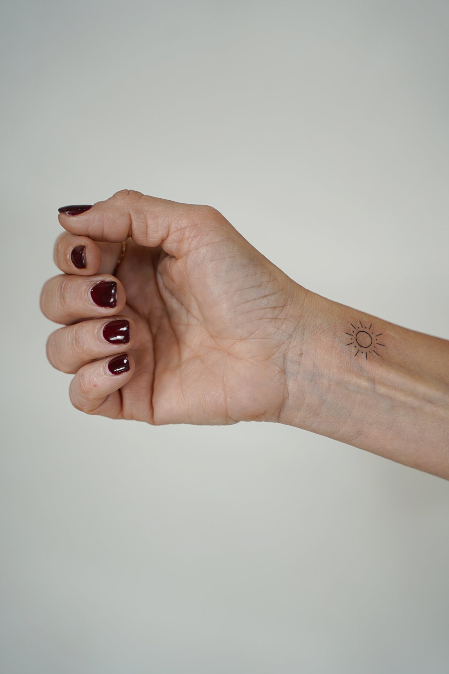 Un sol delicado con pequeños puntos y líneas finas que forman los rayos, colocado en uno de los laterales de la muñeca. Este tipo de diseños suelen funcionar mejor ligeramente desplazados y no centrados. Además, es una zona fácil de cubrir con pulseras o relojes.