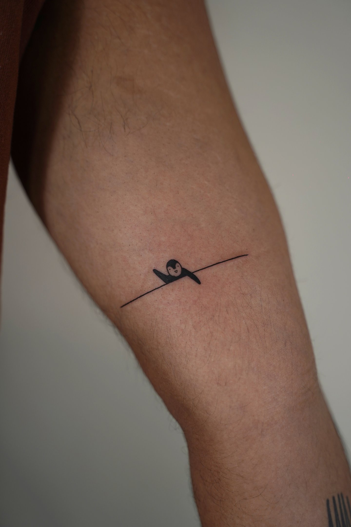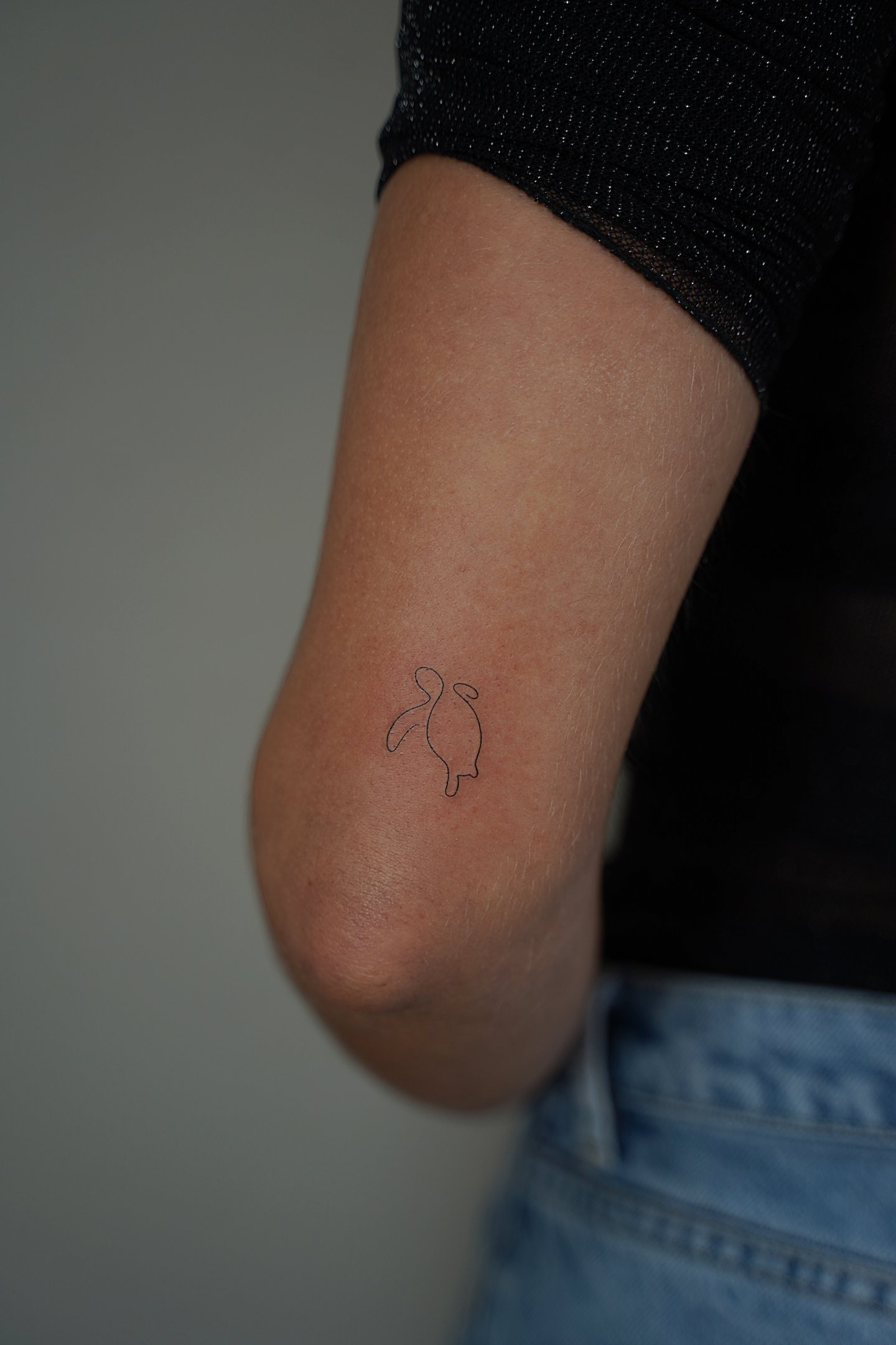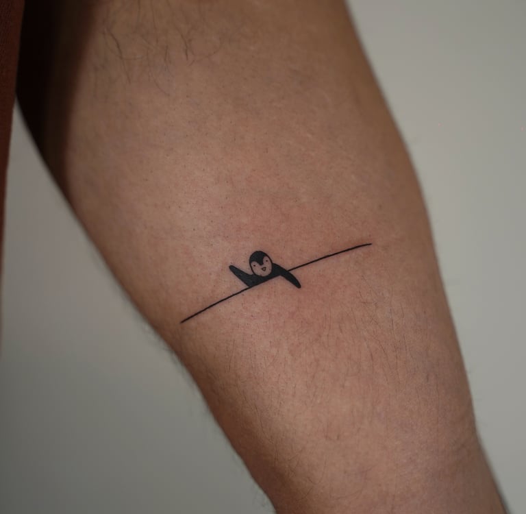 Un pequeño pingüino que parece asomarse por encima de una línea fina, ubicado en la parte interna del brazo. Es un tatuaje discreto y simpático, visible solo cuando la persona decide enseñarlo.