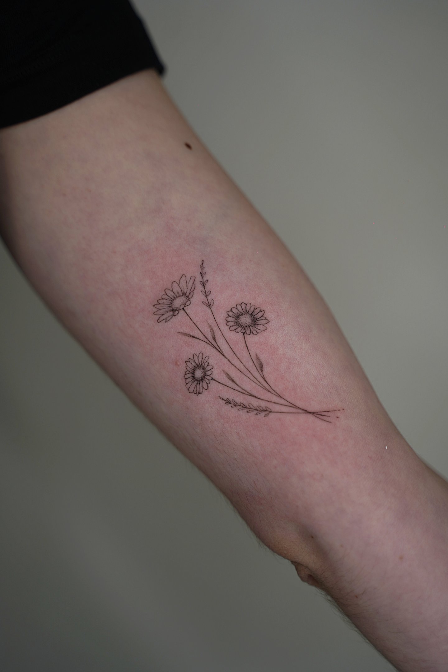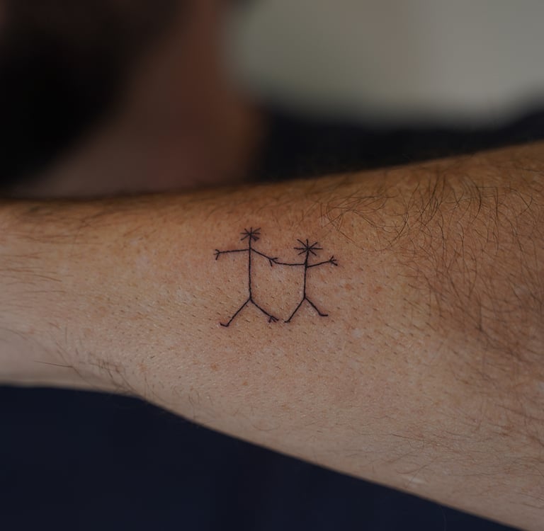 Pequeñas figuras estilo dibujo de palitos, realizadas respetando el trazo original. Están ubicadas en la parte externa del antebrazo, pensadas para poder enseñarlas fácilmente al colocar el brazo en horizontal. Son diseños auténticos y cargados de valor personal.