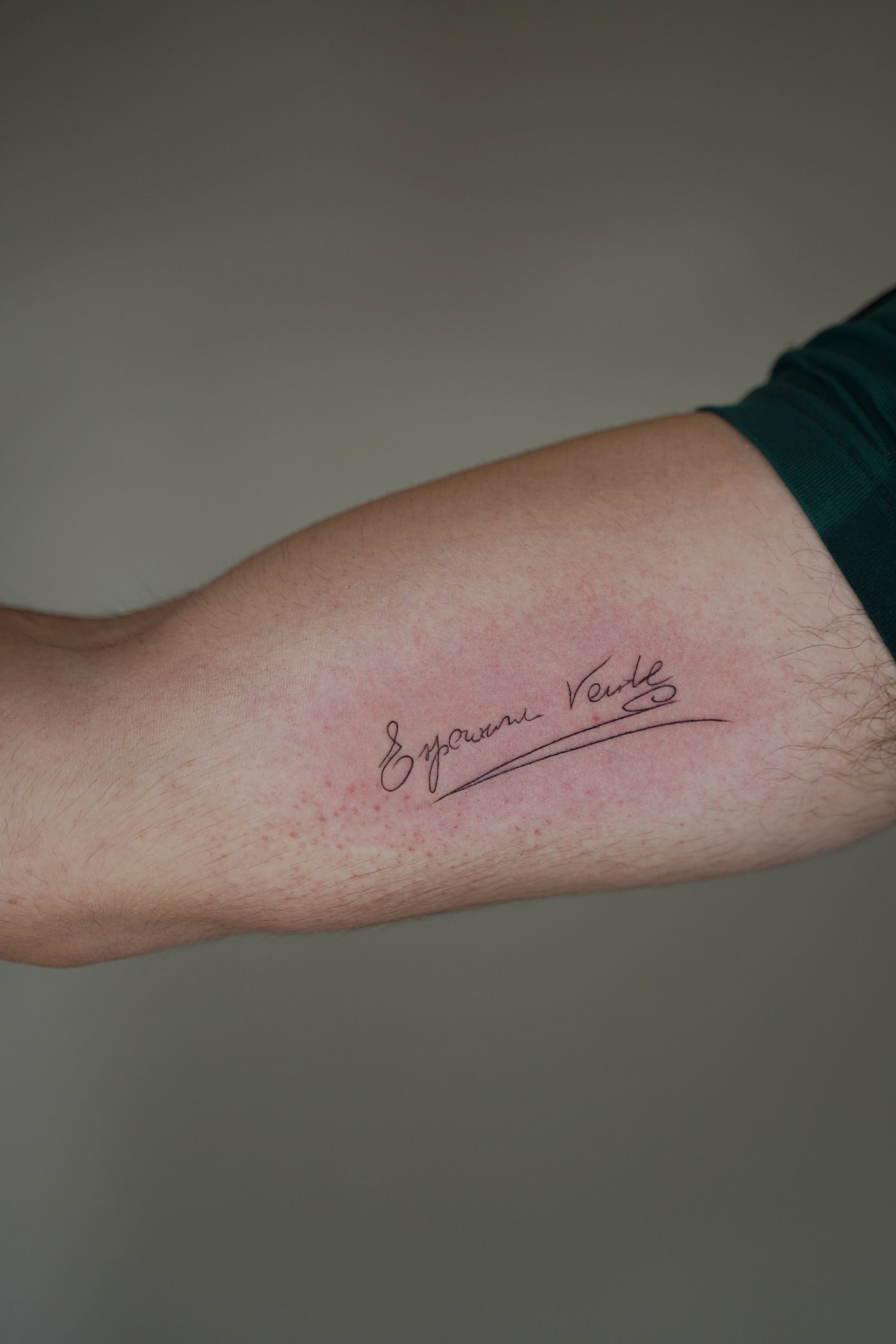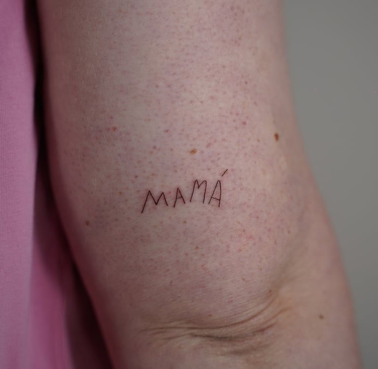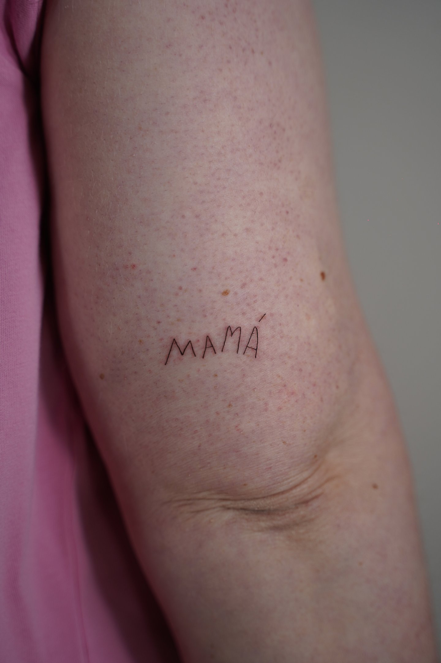 Un tatuaje profundamente emotivo: la palabra “mamá” escrita por un niño y tatuada tal cual, respetando cada trazo original. Ubicado en una zona discreta encima del codo derecho, este diseño destaca por su autenticidad. Cuando la escritura viene directamente de quien lo dedica, el valor emocional se multiplica.