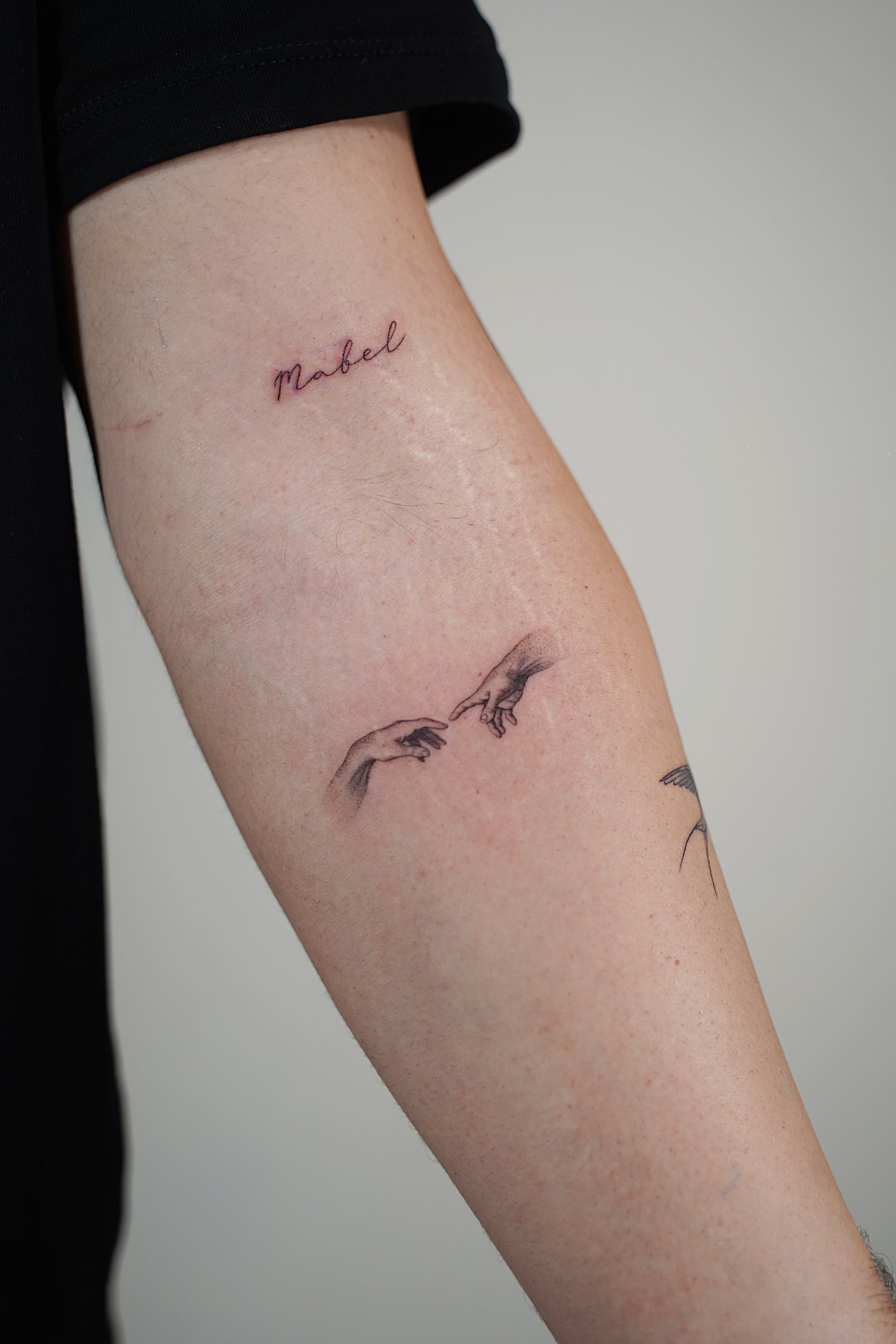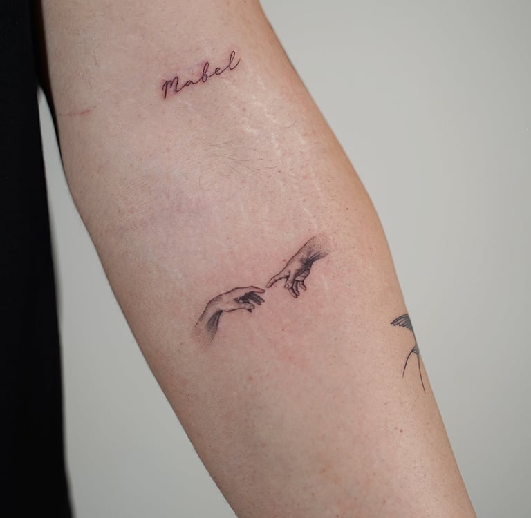 En el mismo conjunto, la clienta añadió la palabra “Mabel” en tipografía cursiva, aportando un toque más íntimo y personal. La combinación de arte clásico y nombre propio crea una composición equilibrada dentro del estilo fineline.