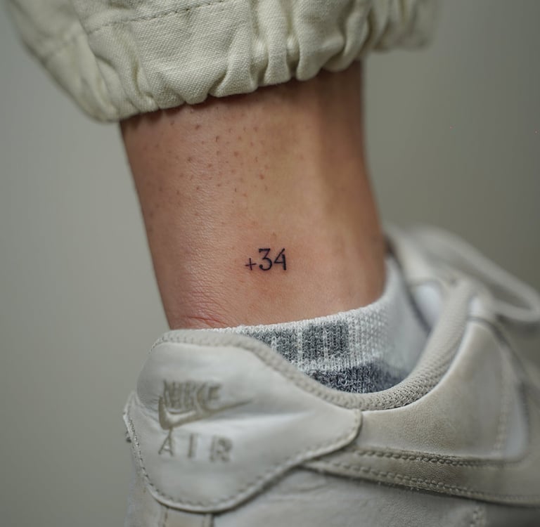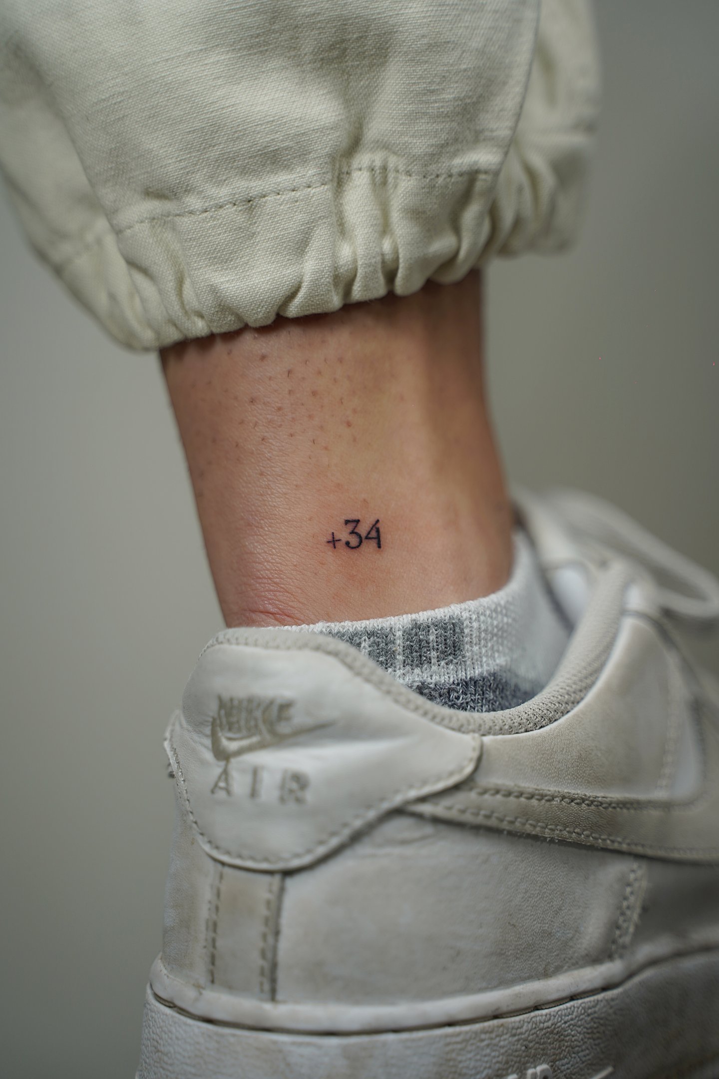 El número +34, código telefónico de España, es un tatuaje muy solicitado por turistas que quieren llevarse un recuerdo permanente del país. En este caso está ubicado en el tobillo, una zona estratégica, discreta y elegante. Un diseño pequeño, directo y con un claro significado de identidad o conexión con España.