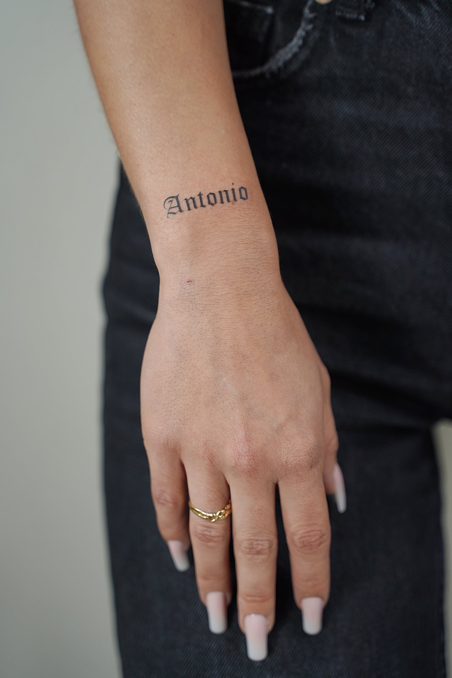 El nombre “Antonio” en un estilo de letra editorial grueso-fino, situado en la parte frontal de la muñeca. Es una zona muy visible, aunque puede ocultarse fácilmente con una pulsera o reloj si se desea. Este tipo de tatuajes de nombres siguen siendo muy solicitados por su equilibrio entre elegancia y significado.