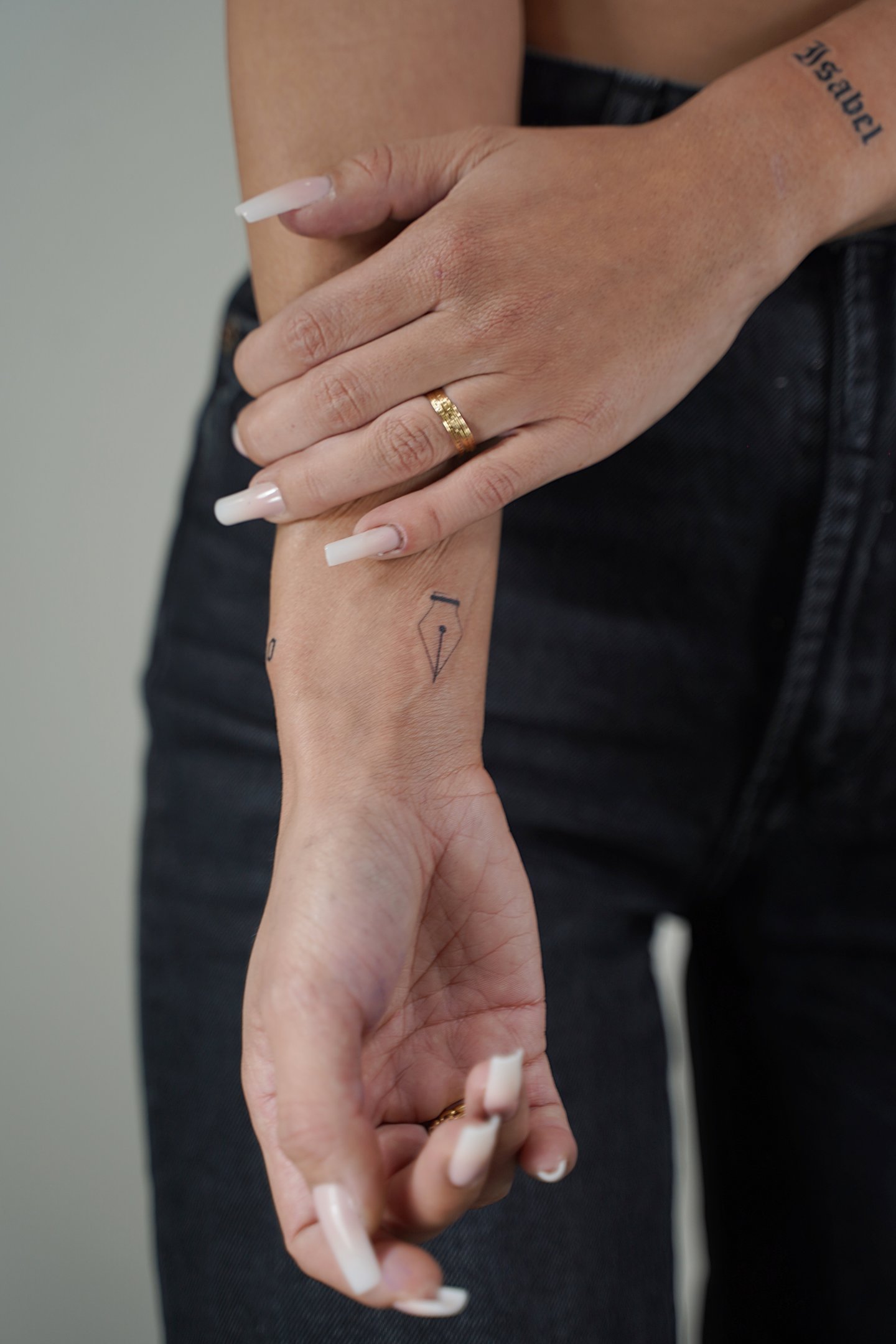 La cabeza de una pluma de escribir, diseñada de forma abstracta y minimalista, enfocándose en la punta y su contorno elegante. Ubicada en el antebrazo o la parte interna de la muñeca, este tatuaje fineline representa creatividad y expresión personal sin necesidad de detalles recargados. Su simplicidad permite que destaque sutilmente, aportando un toque artístico y delicado que invita a la imaginación.
