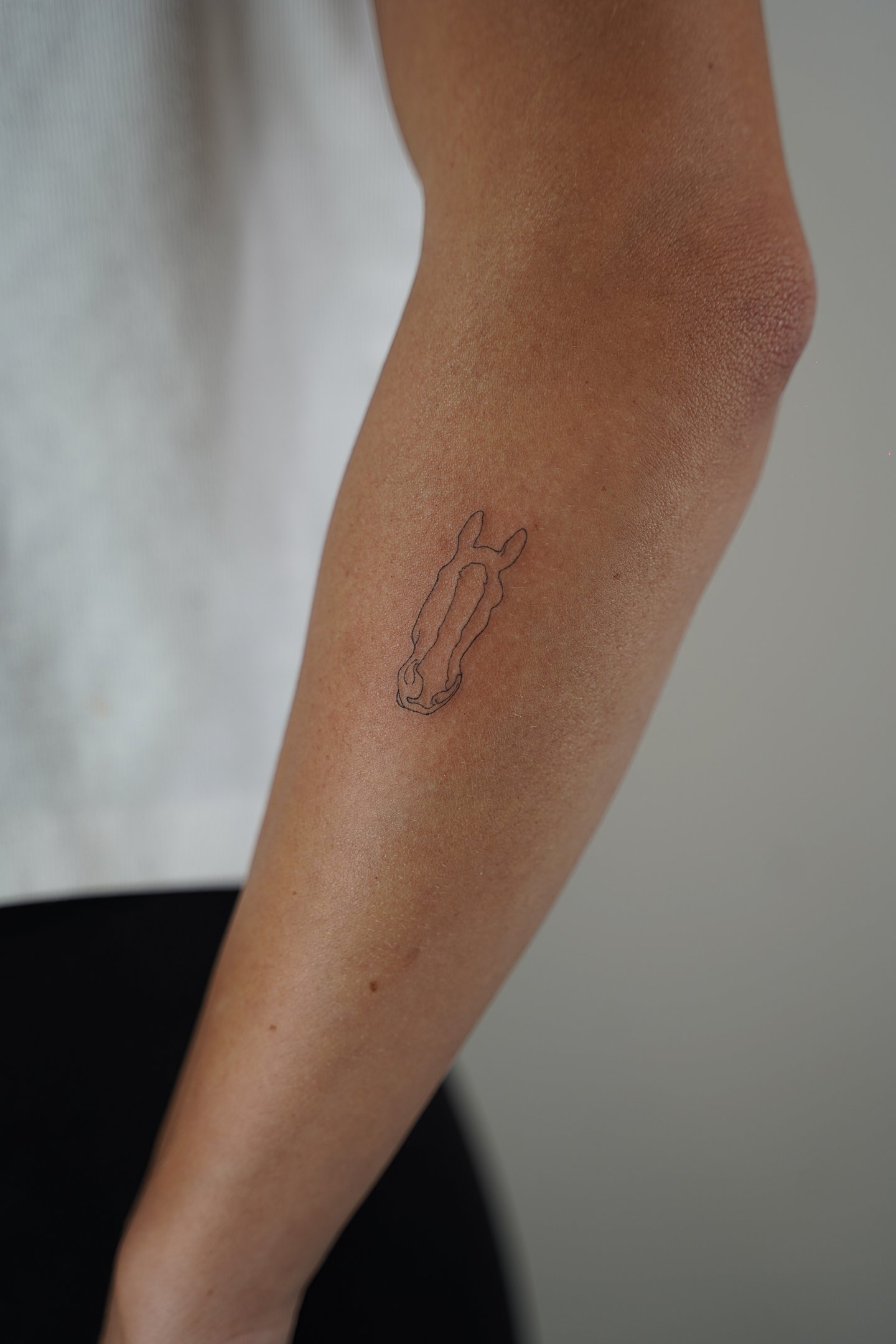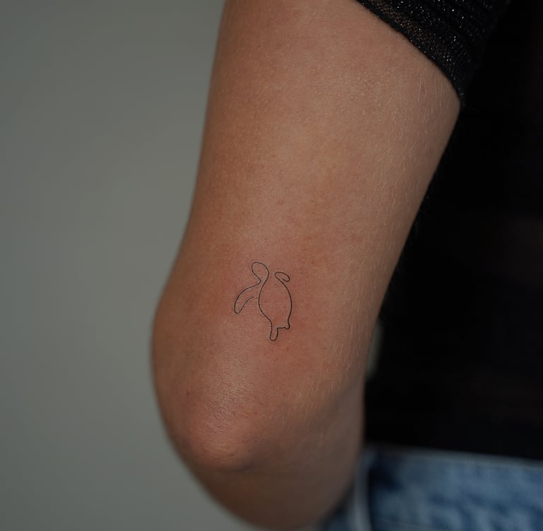 Un tatuaje fineline de tortuga realizado en estilo one line, muy simple y limpio, ubicado justo encima del codo. Este tipo de tatuajes minimalistas funcionan muy bien en zonas visibles pero discretas. La tortuga suele simbolizar calma, constancia y conexión con la naturaleza, y en línea fina es uno de los diseños más elegidos cuando se busca algo pequeño pero con significado.