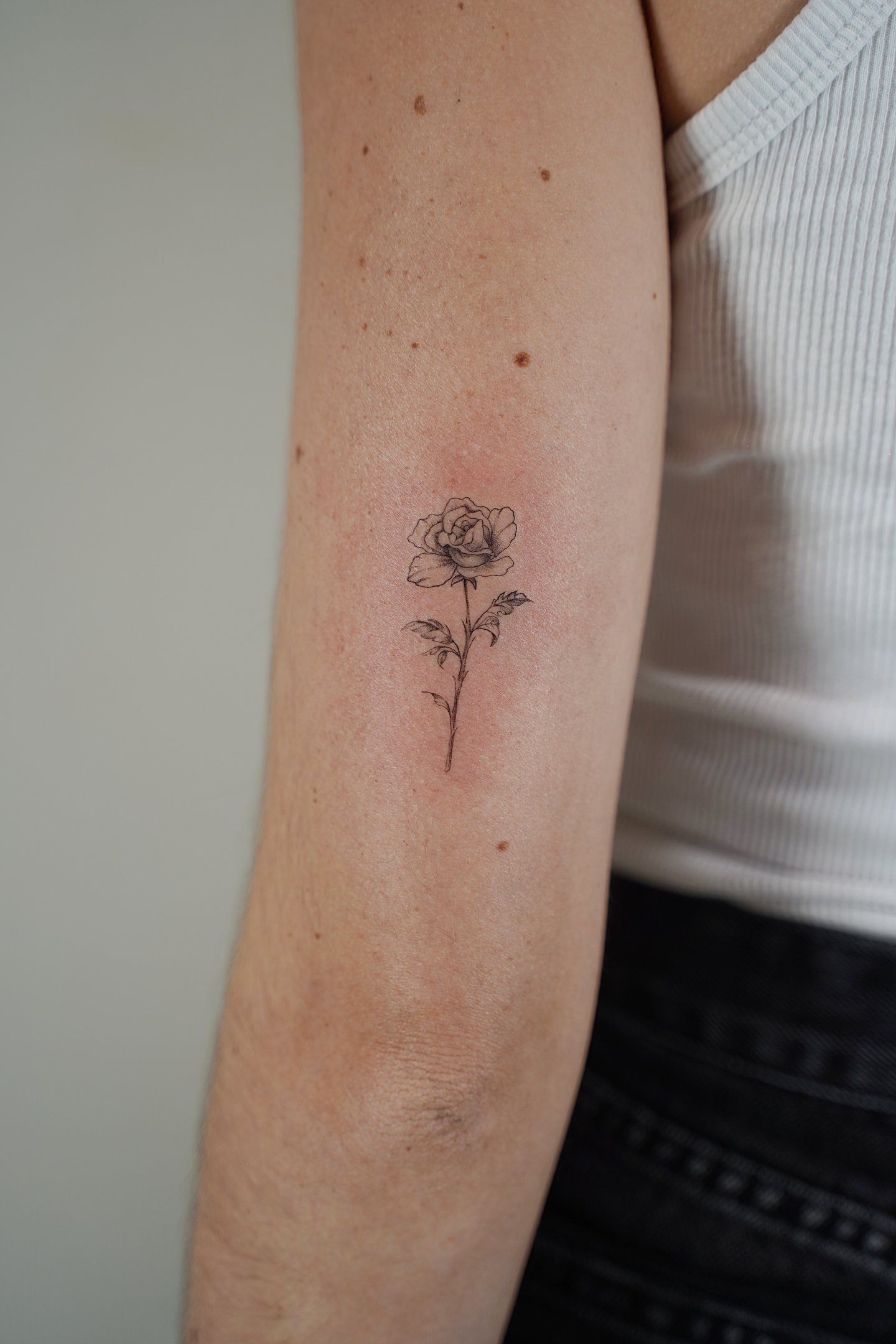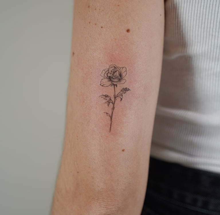 Una rosa realizada en línea fina con un ligero trabajo de sombras que aporta detalle y profundidad. Ubicada encima del codo, esta zona permite que el diseño respire y se vea completo. Es una reinterpretación delicada de un clásico atemporal del tatuaje.