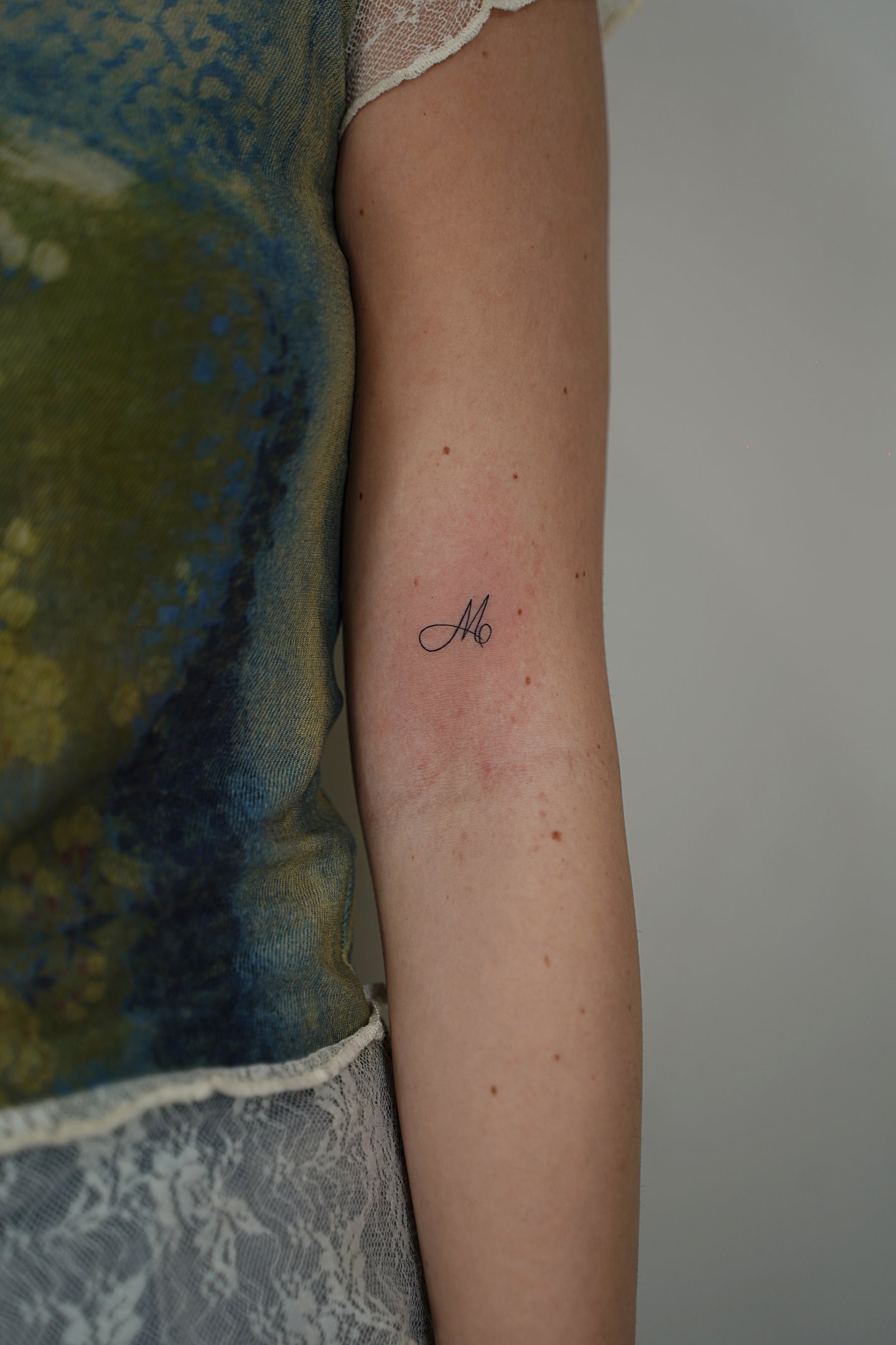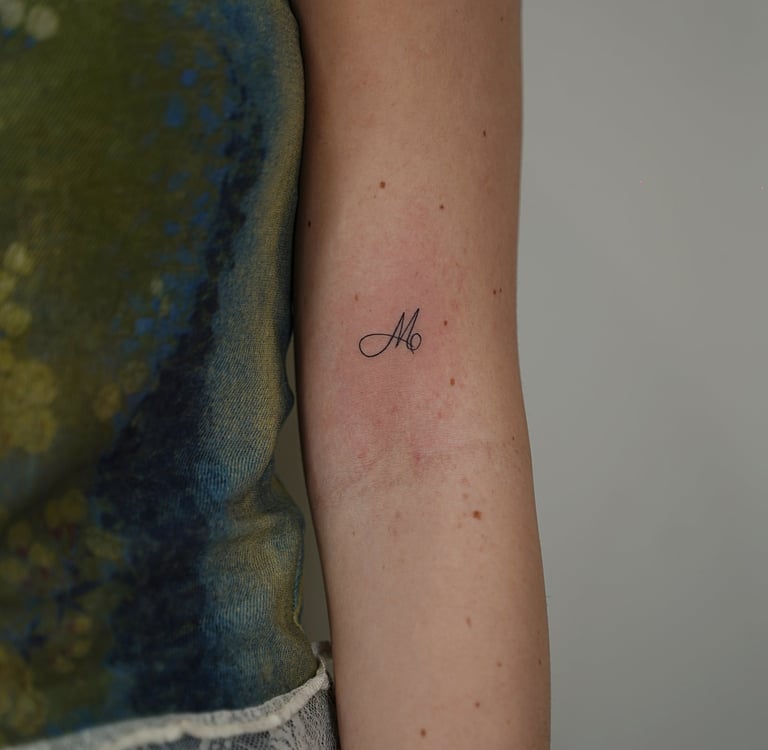 Una inicial “M” en cursiva con un pequeño detalle de filigrana en línea fina. Está situada en una zona frontal del brazo, visible en el día a día. Este tipo de iniciales elegantes siguen siendo una opción muy popular dentro del estilo fineline.