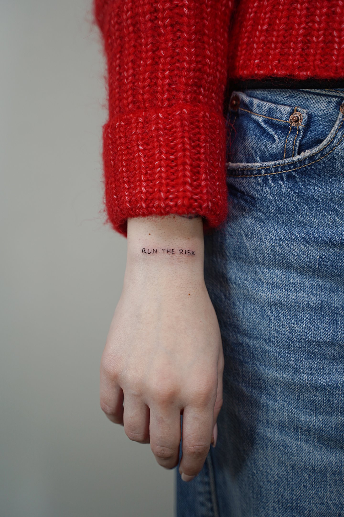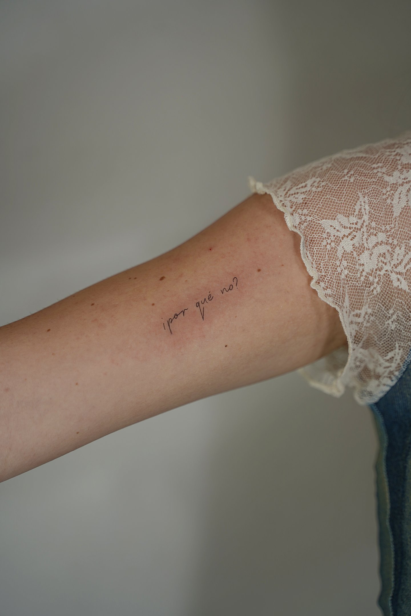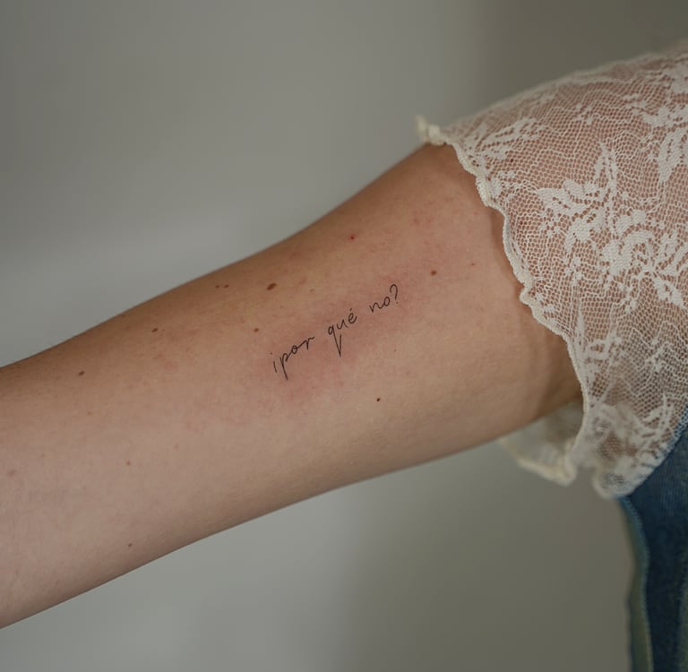 Una frase que normalmente se tatúa como “why not”, pero en este caso se realizó en español: “¡por que no?”. El resultado mantiene la misma actitud decidida y espontánea. Está situada en una zona poco habitual del brazo, pensada para que la propia persona pueda leerla fácilmente. Un tatuaje con carácter, sencillo pero con mensaje claro.