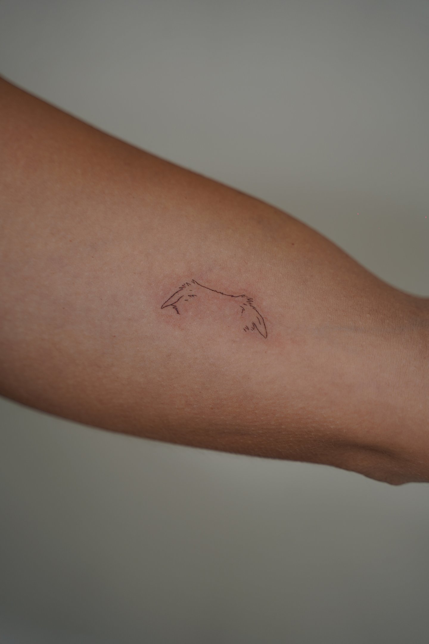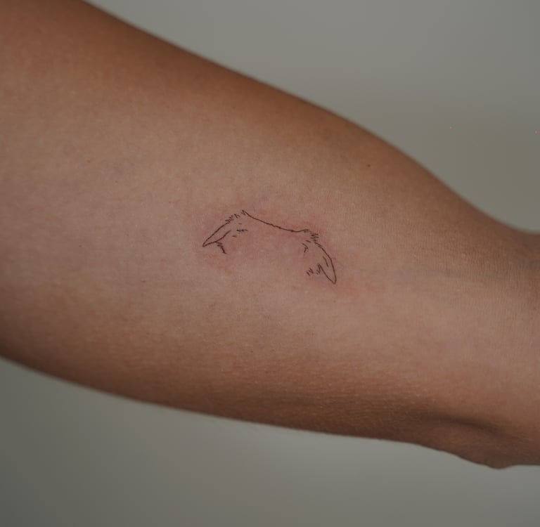 Un diseño de orejas de perro trabajado de forma simple y ligeramente abstracta. Muchas veces no es necesario tatuar el animal completo para representarlo; pequeños detalles como orejas u hocicos pueden transmitir perfectamente el vínculo. Es una opción muy elegante para amantes de los perros.