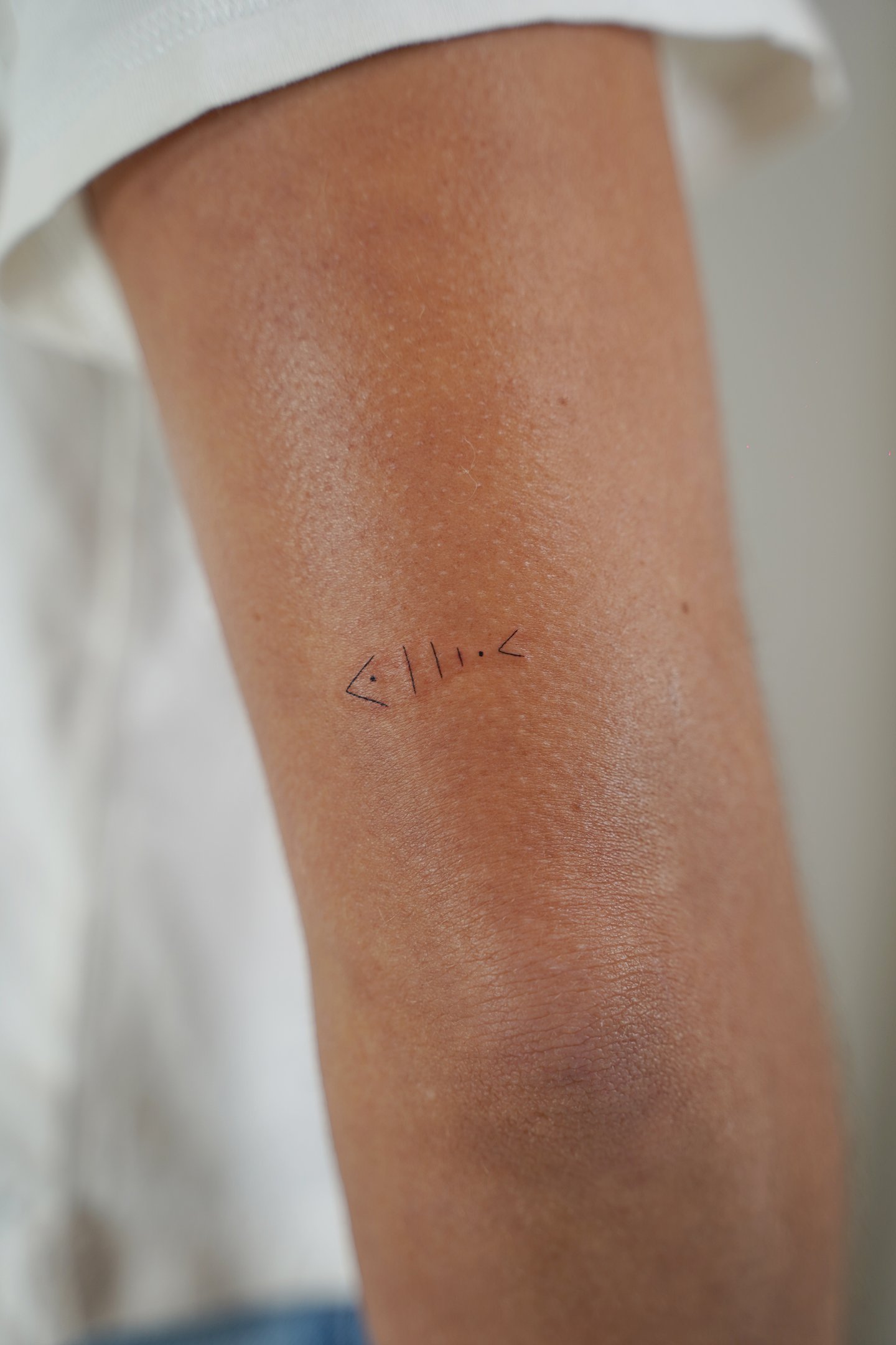 Un pez realizado con combinación de líneas finas y pequeños puntos, ubicado encima del codo. Tiene un carácter ligeramente abstracto que invita a mirarlo con más atención para descifrar su forma. Este tipo de tatuajes minimalistas generan un resultado moderno y artístico.