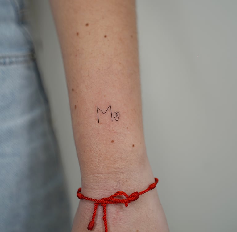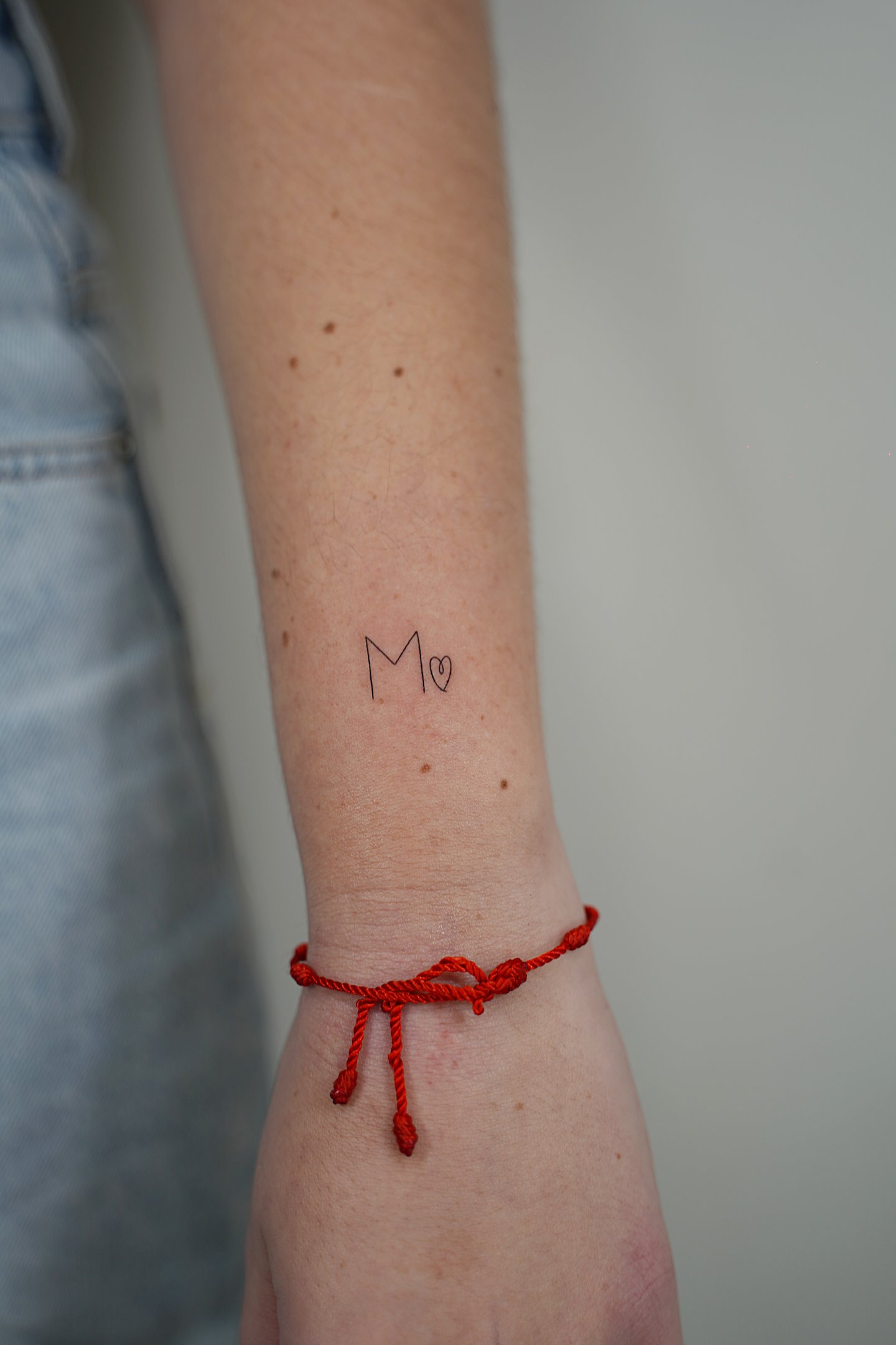 Una letra “M” acompañada de un pequeño corazón, ambos dibujados por alguien especial. Ubicado en una zona visible del brazo, es un tatuaje sencillo pero lleno de significado. Cuando la escritura es auténtica, el diseño gana aún más fuerza.