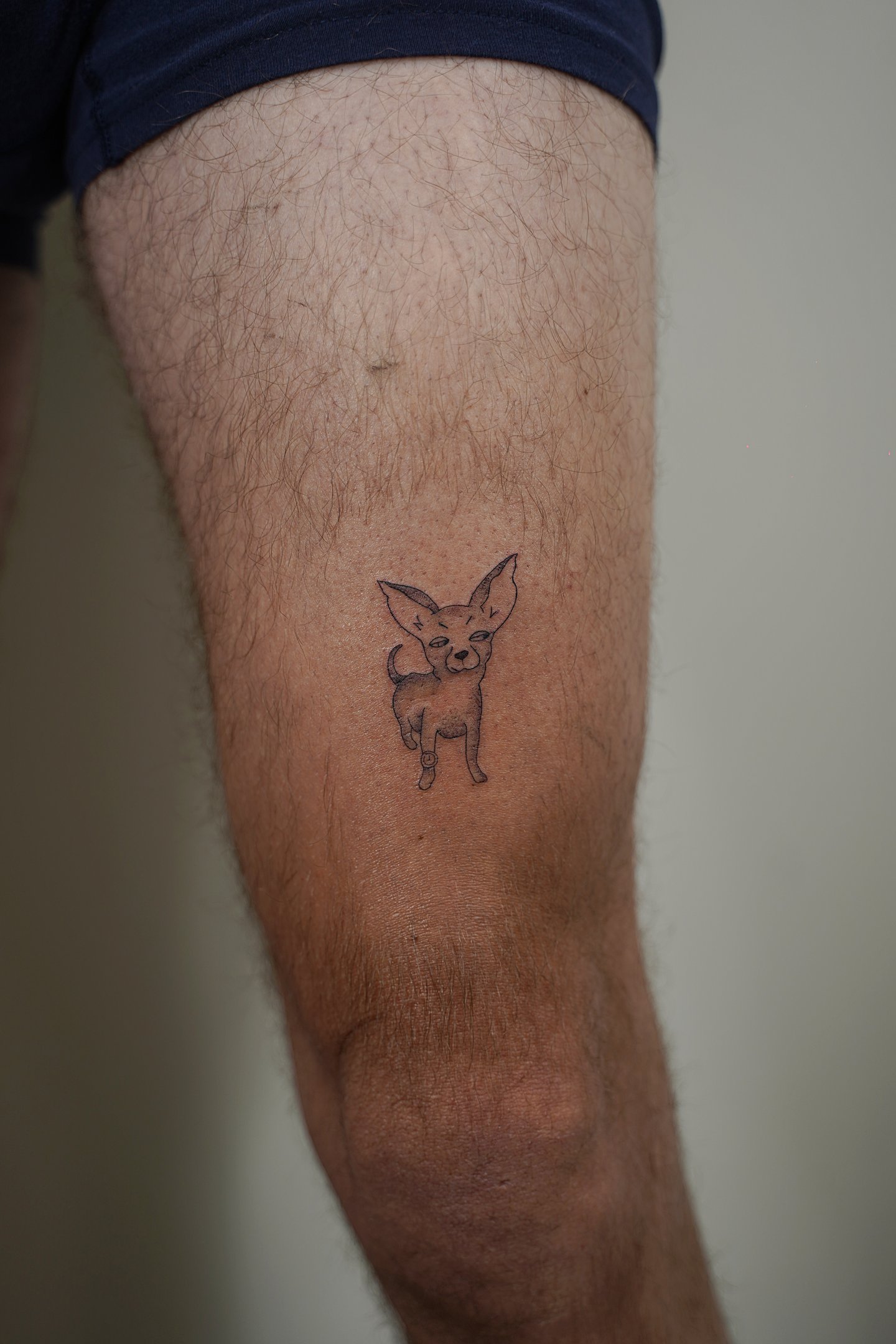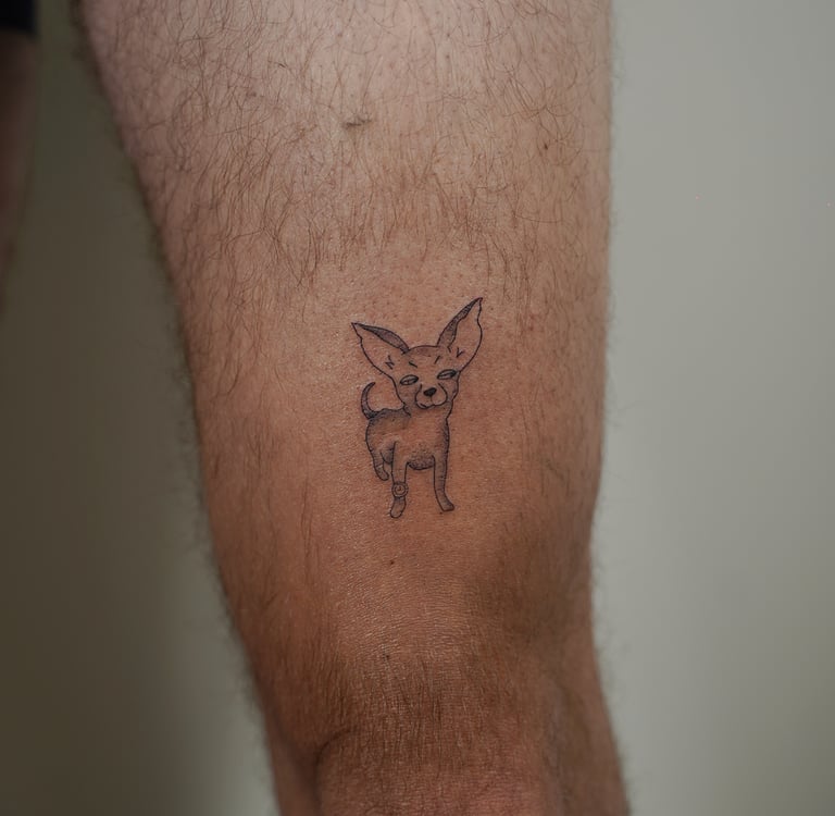 Un perro realizado en versión ligeramente cartoon, con el detalle peculiar de llevar un reloj. Todo trabajado en línea fina y con un acabado delicado. Es un diseño original que mezcla ternura y personalidad dentro del estilo fineline.