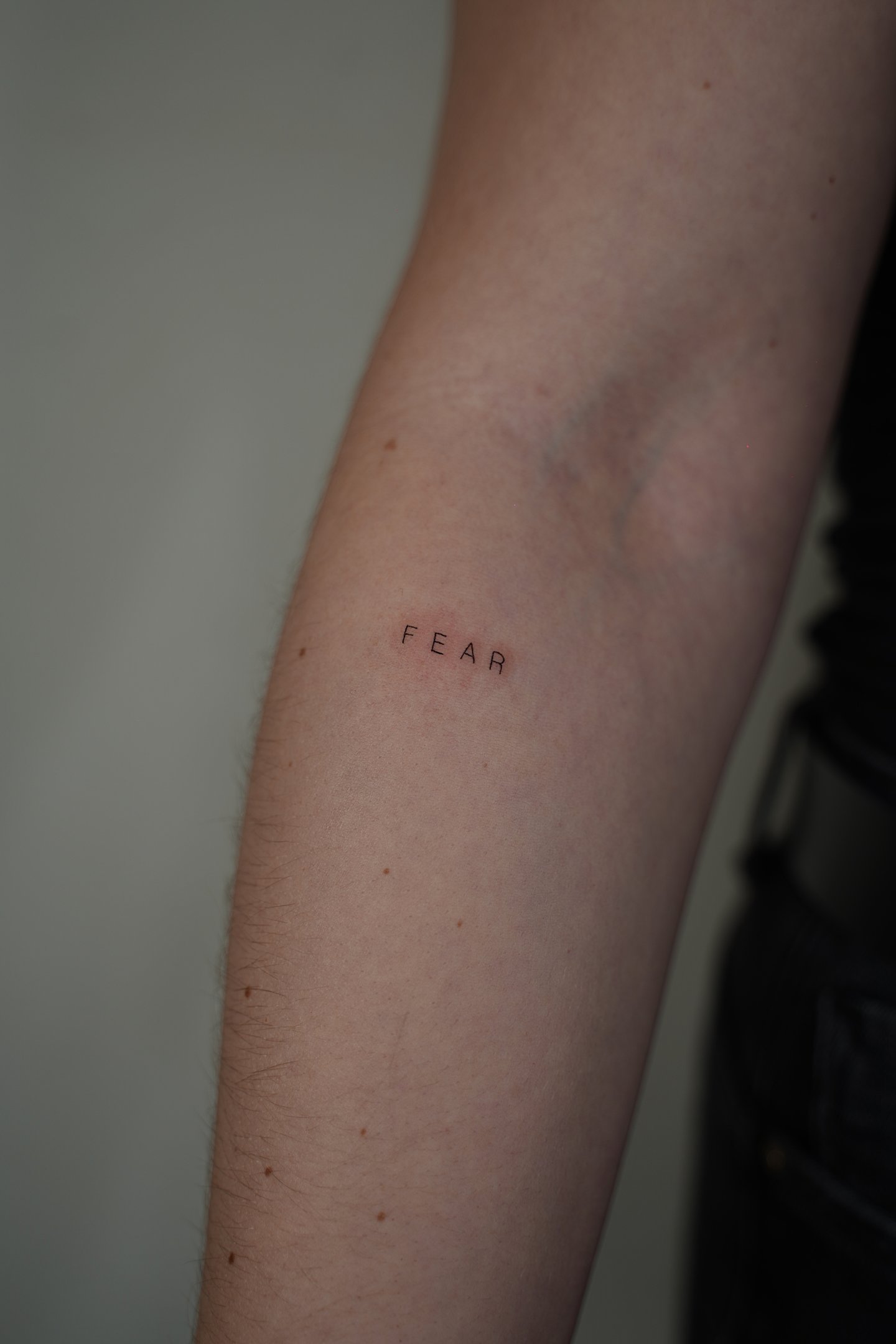 La palabra “FEAR” (miedo en inglés) escrita en mayúsculas con una ligera separación entre letras, ubicada hacia un lateral del antebrazo, no centrada. Este pequeño desplazamiento le da un aire moderno y diferente. Es un tatuaje minimalista con mensaje directo.