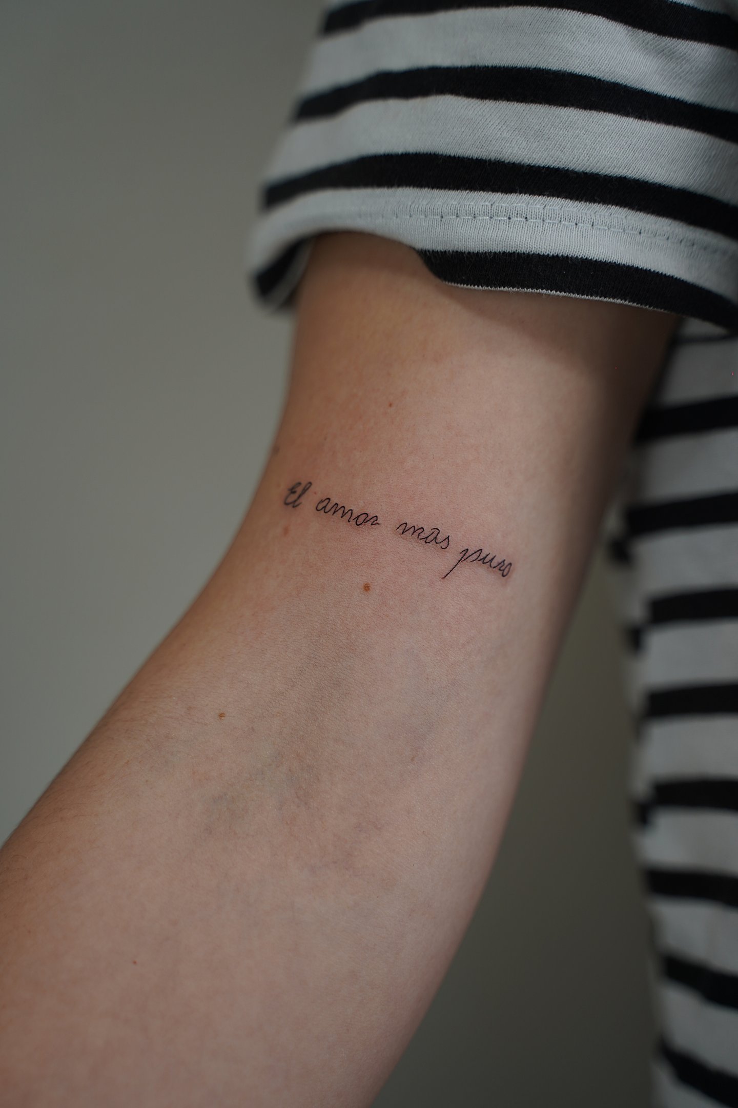 La frase “El amor más puro”, escrita por alguien especial, situada en una zona del brazo que se lee de frente y siempre está visible. Este tipo de tatuajes fineline manuscritos tienen un componente emocional muy fuerte porque conservan la esencia original de quien lo escribió.