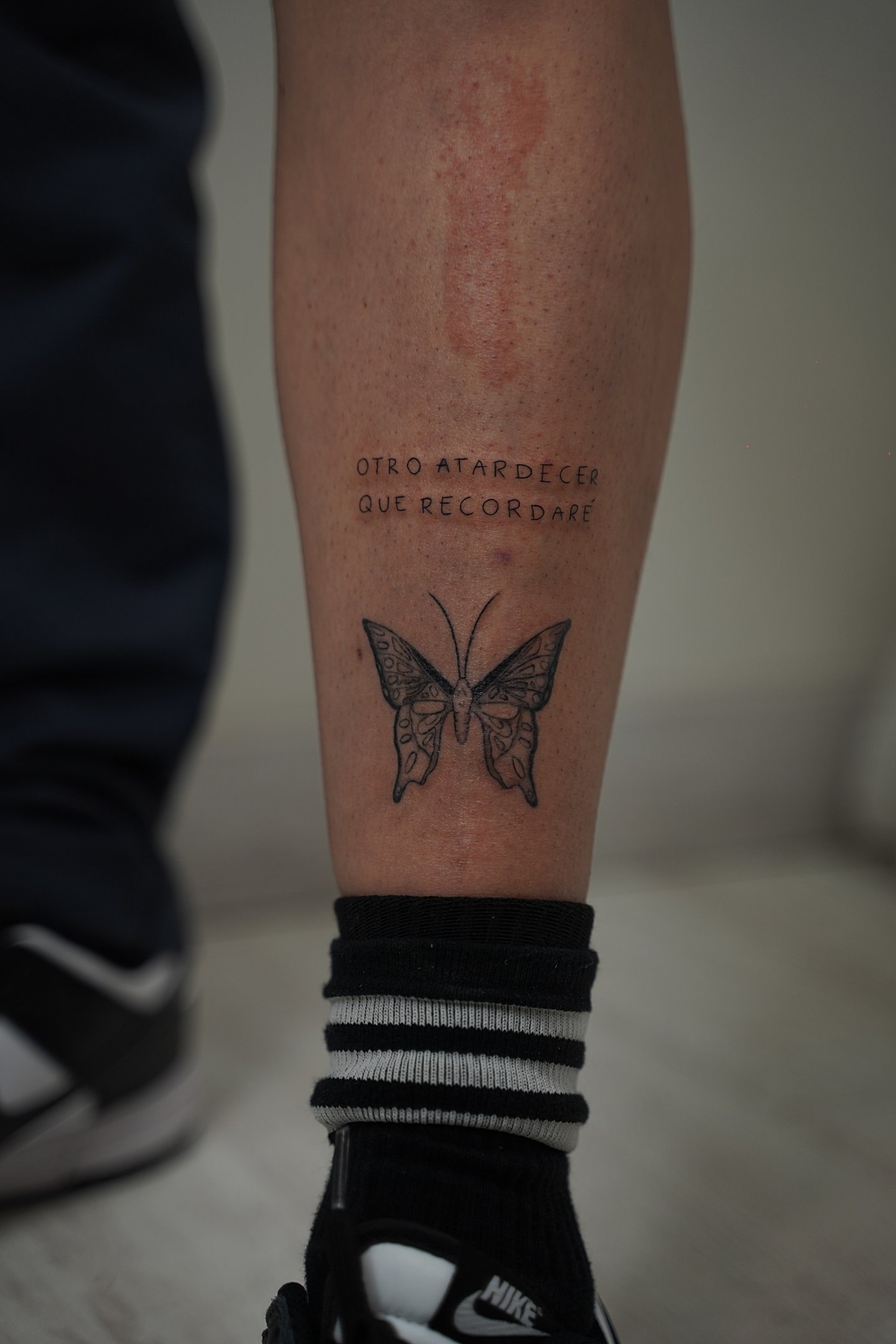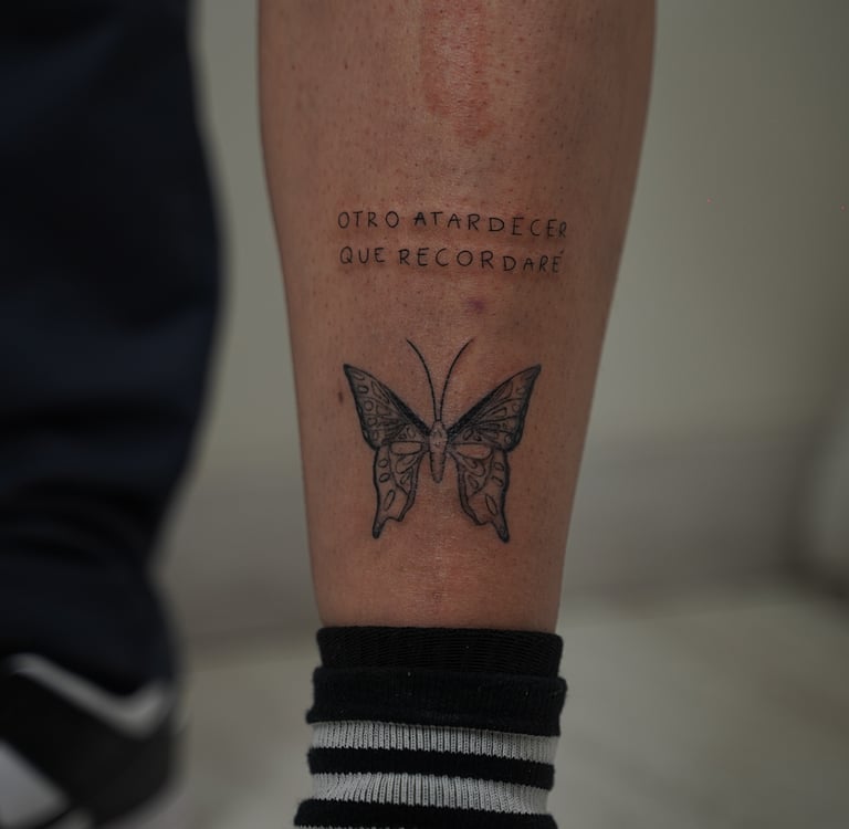 La frase “OTRO ATARDECER QUE RECORDARÉ”, en mayúsculas y escrita por una persona especial, acompañada de una mariposa que el cliente trajo como referencia y que tatuamos respetando el diseño original. Es un conjunto muy personal que mezcla recuerdo y transformación.