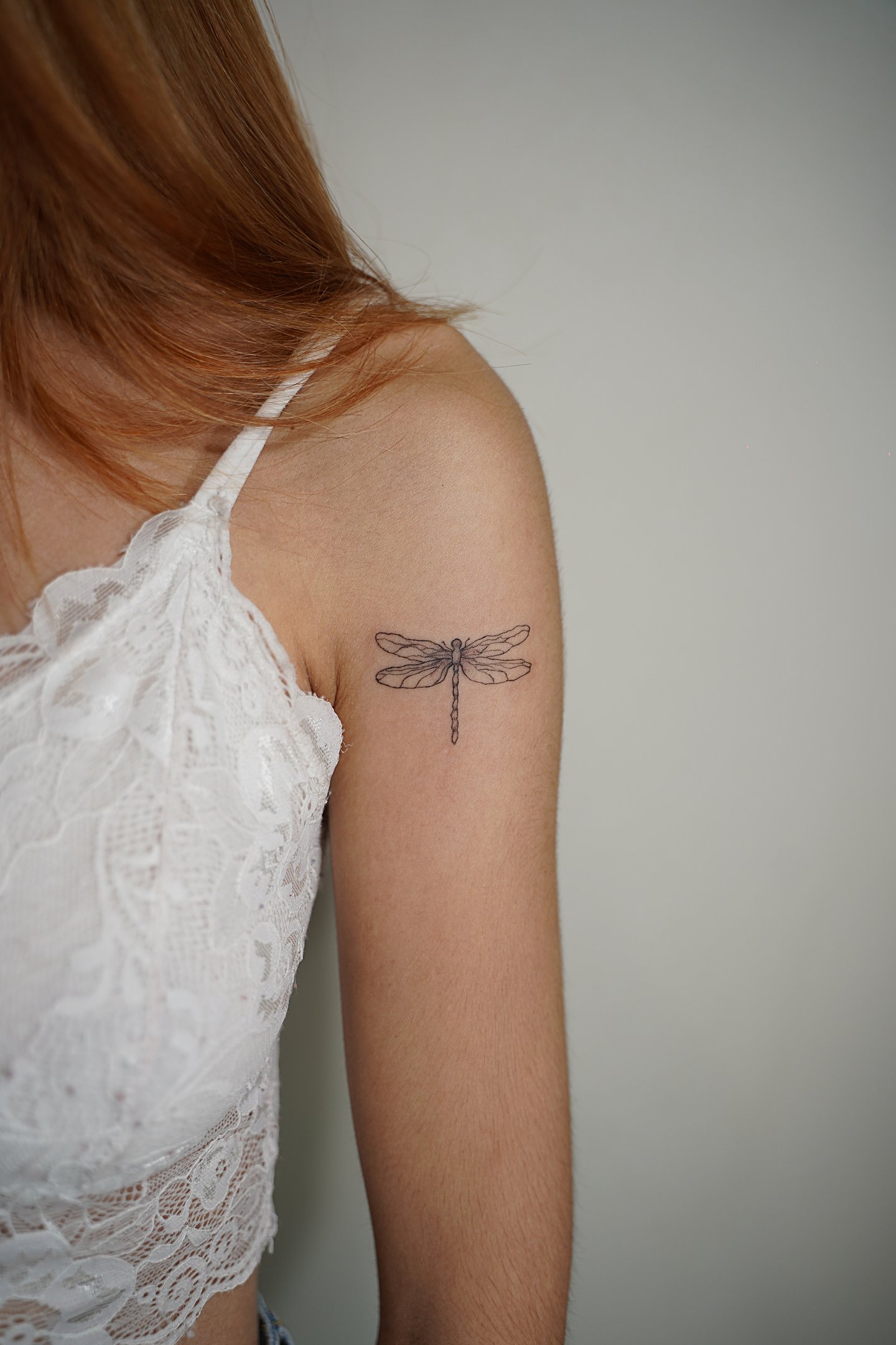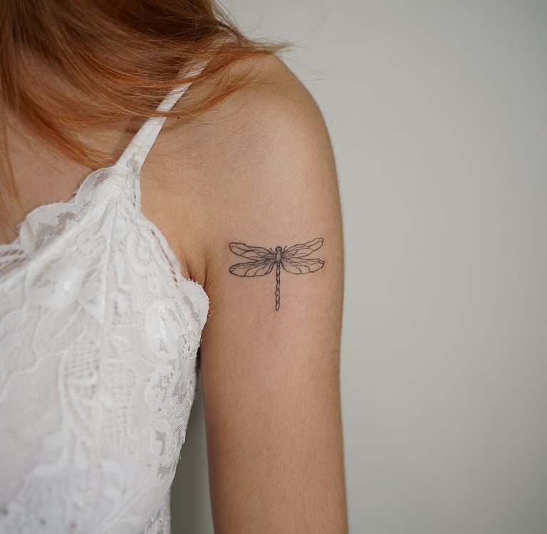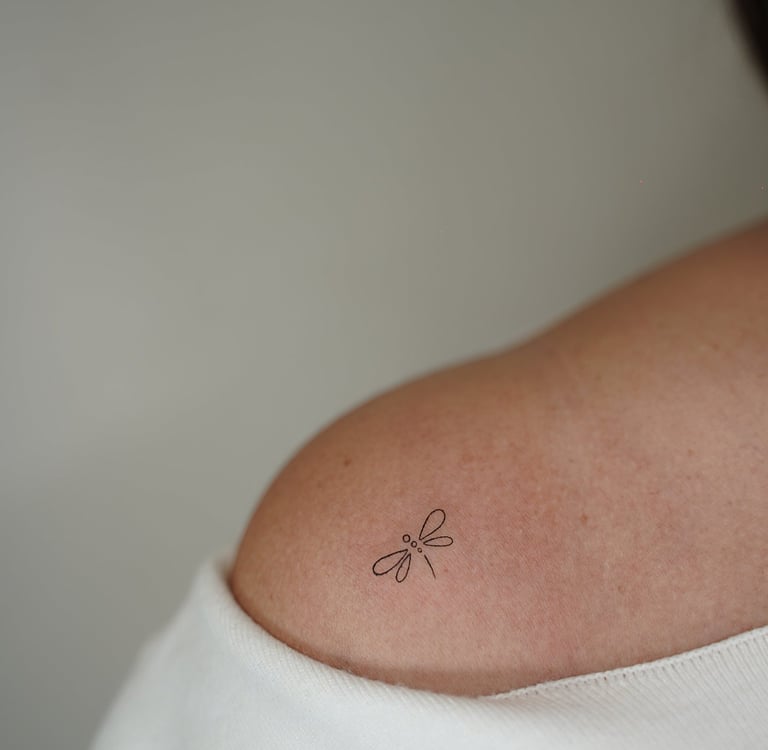 Una libélula muy pequeña y fina, trabajada con un enfoque ligeramente abstracto. Ubicada en el hombro como un detalle sutil, este tipo de tatuajes funcionan casi como un accesorio delicado sobre la piel. La simplicidad del trazo fineline permite que el diseño respire y mantenga una estética muy elegante.