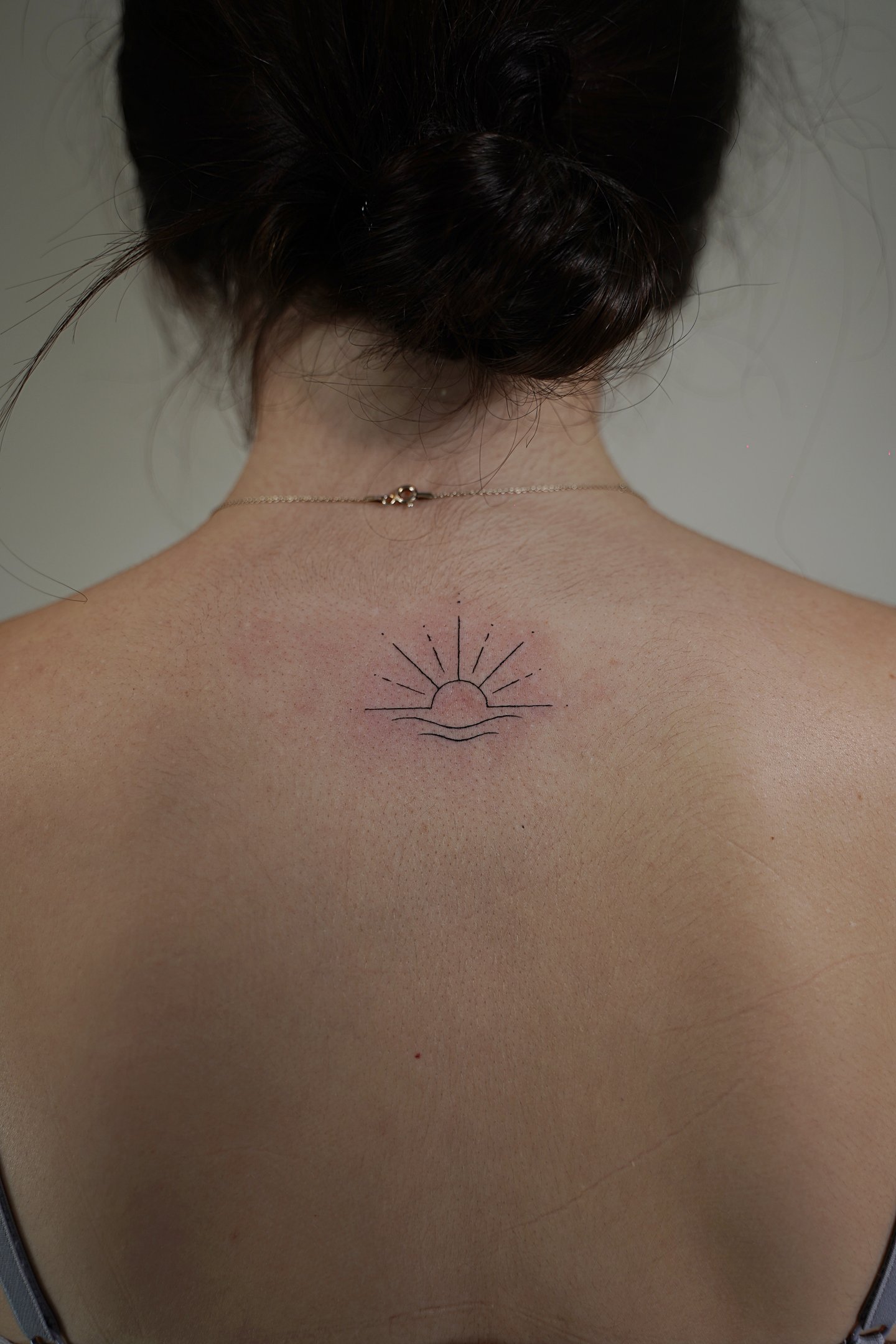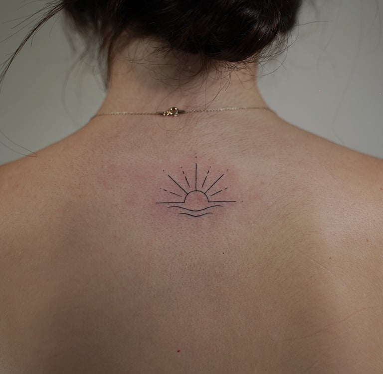 Un diseño de sol acompañado de mar y pequeños detalles en puntillismo, situado en la parte alta de la columna, justo debajo de la nuca. Los soles en esta zona quedan especialmente bien y ofrecen muchas posibilidades de ampliación futura, ya sea con frases o con más elementos siguiendo la línea de la columna.