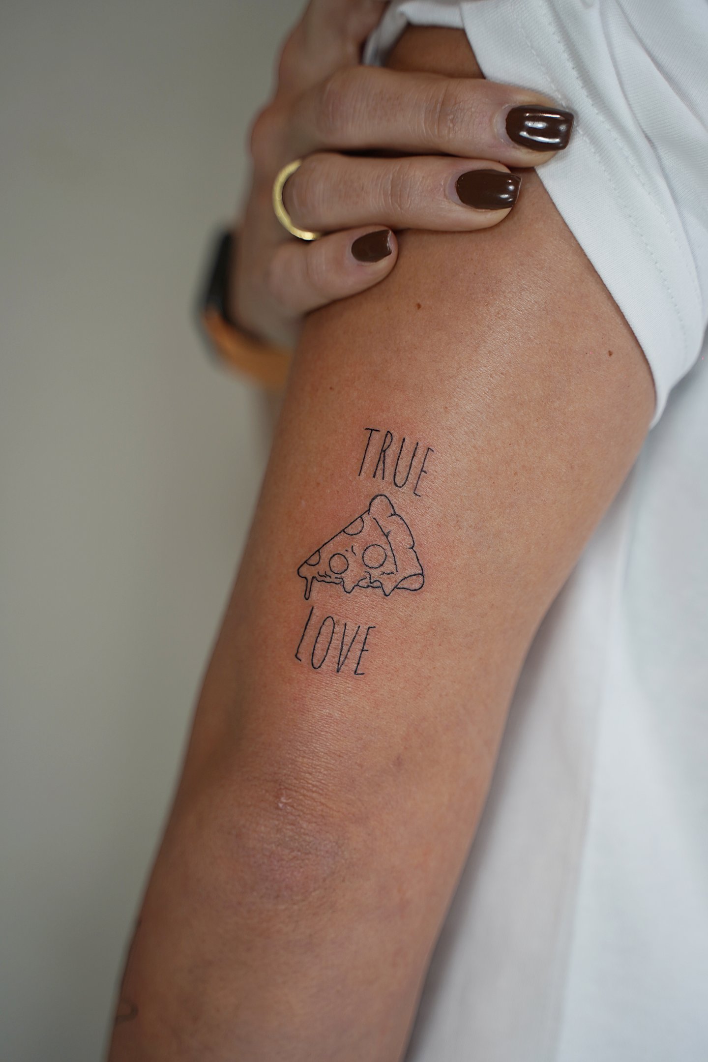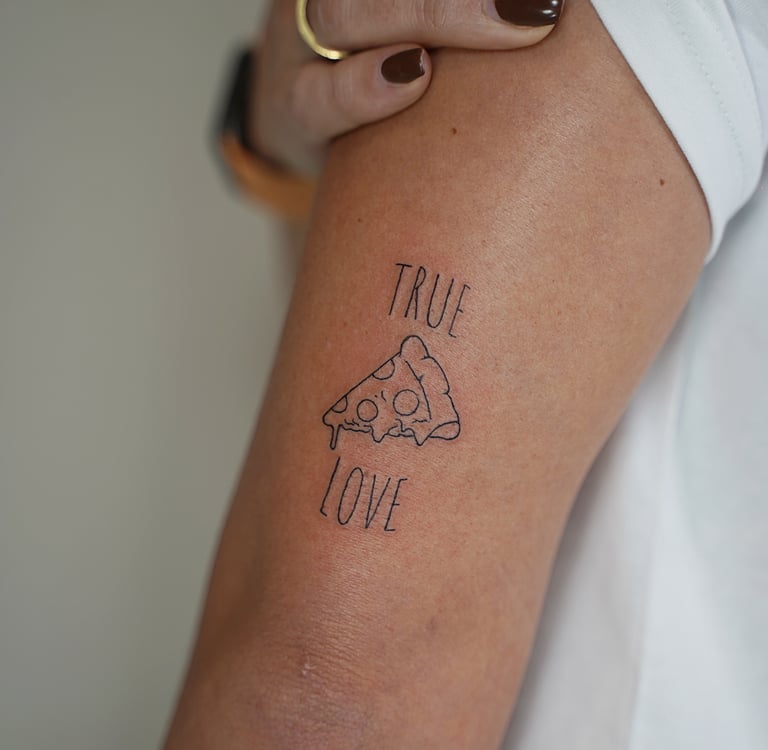 Un tatuaje divertido y original que combina la frase “TRUE LOVE” en mayúsculas, con un estilo de letra ligeramente alargado, junto a una pizza. Es una pieza simpática que mezcla humor y personalidad dentro del estilo fineline.