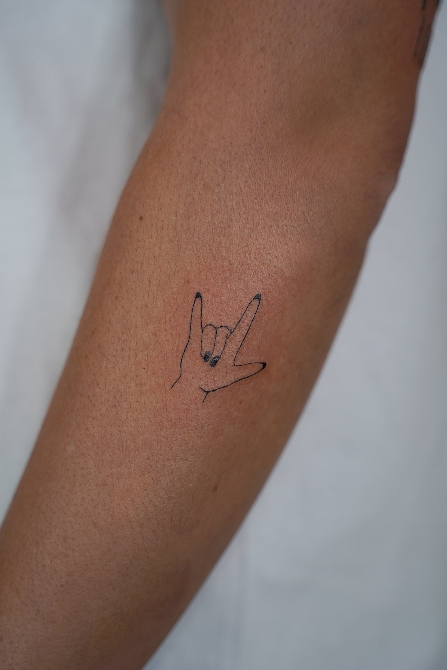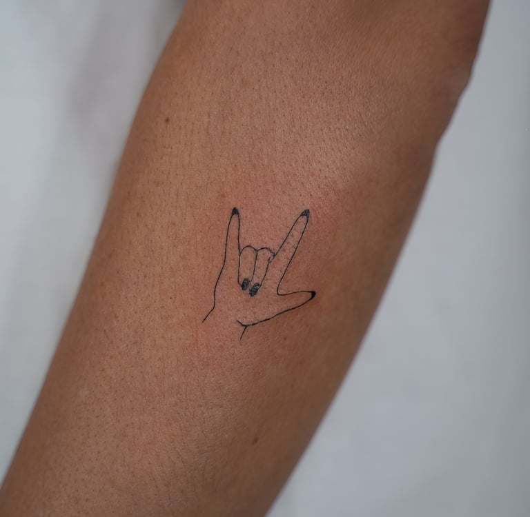 Una mano realizando el gesto clásico del rock and roll, con las uñas pintadas de negro como detalle distintivo. Trabajado en línea fina, mantiene el equilibrio entre actitud y delicadeza. Es un tatuaje pequeño pero con mucha personalidad.