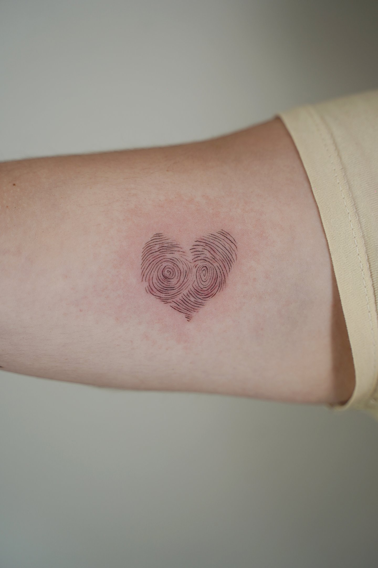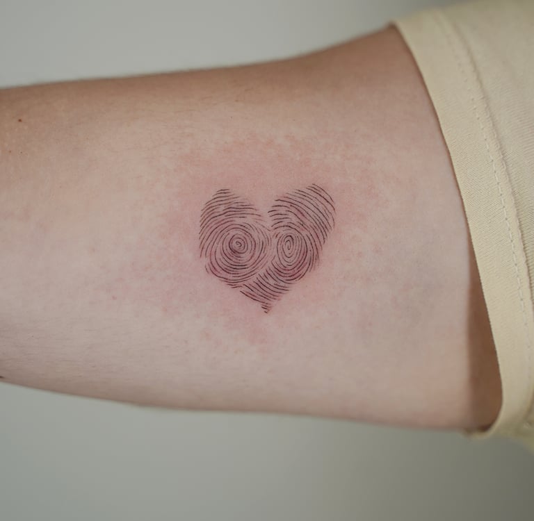 Dos huellas de dedos pulgares que, al unirse, forman un corazón. Ubicadas en el antebrazo, representan la unión de dos personas especiales de una forma totalmente única, ya que no hay dos huellas iguales. Este tipo de tatuajes fineline personalizados tienen un valor emocional muy fuerte y funcionan muy bien en zonas visibles pero elegantes.