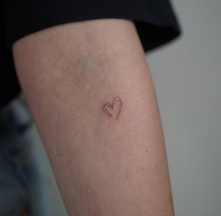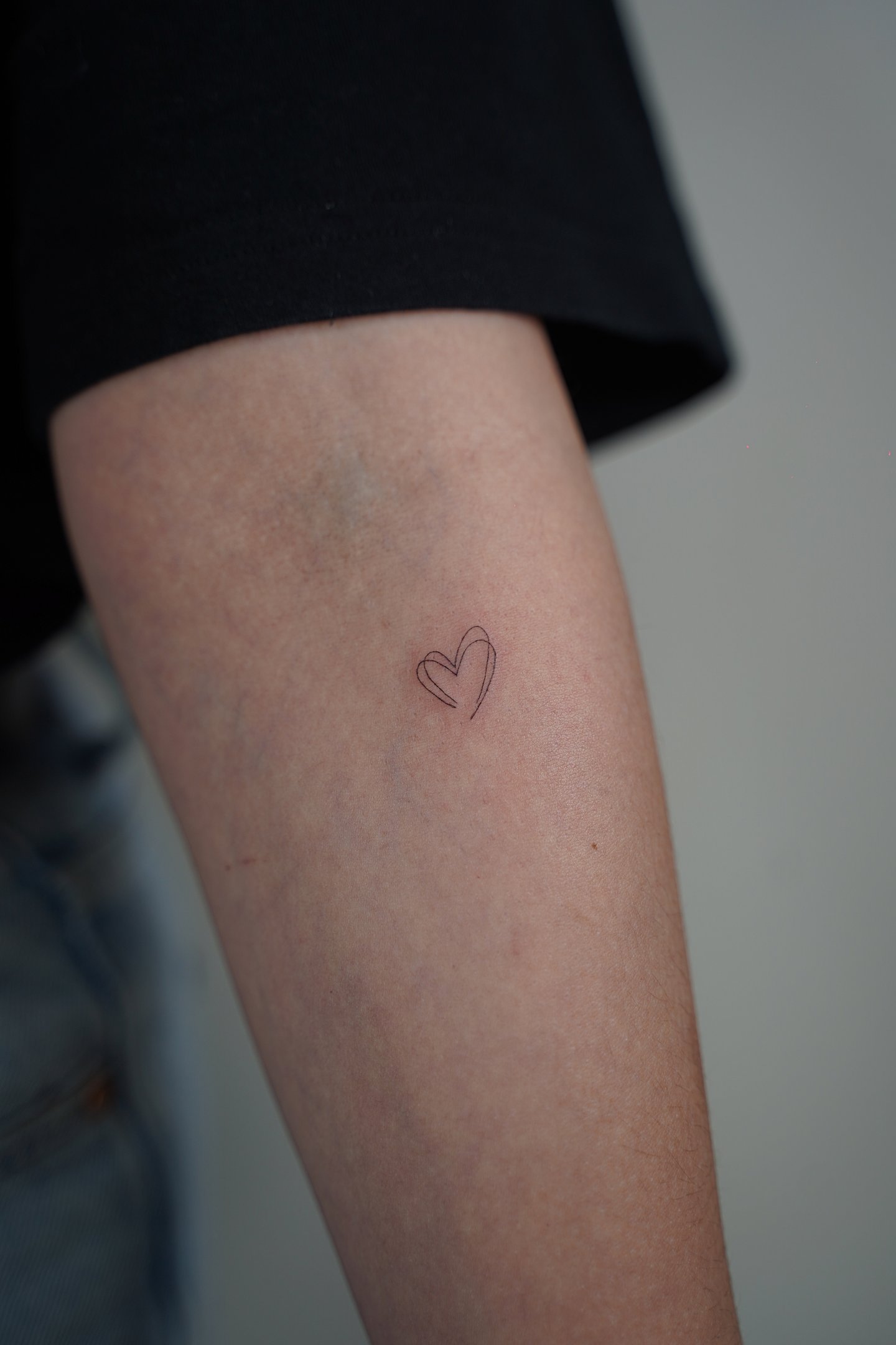 Un corazón realizado con doble línea, donde uno parece superponerse ligeramente al otro, generando sensación de movimiento y profundidad. Está situado en el antebrazo, un poco desplazado hacia un lateral y no completamente centrado, lo que le da un aire más moderno. Es un diseño sencillo pero visualmente muy dinámico.